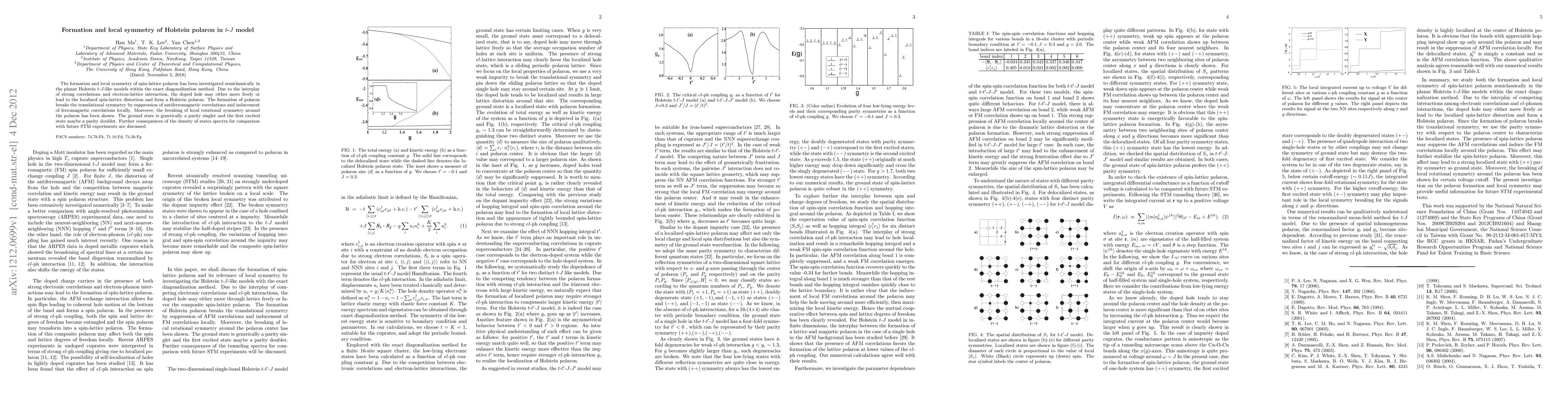 This paper investigates the formation and local symmetry of Holstein polarons in planar t-J models using exact diagonalization. The study reveals that the doped hole can either move freely or induce localized spin-lattice distortions, forming a polaron that breaks translational and local rotational symmetries, with the ground state being a parity singlet.