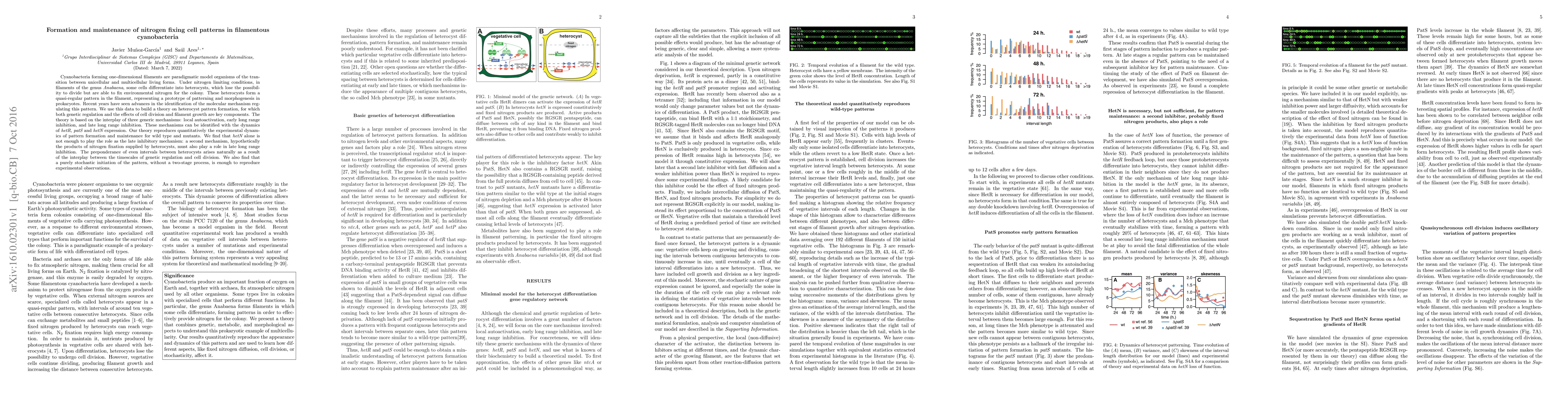Cyanobacteria forming one-dimensional filaments are paradigmatic model organisms of the transition between unicellular and multicellular living forms. Under nitrogen limiting conditions, in filaments of the genus Anabaena, some cells differentiate into heterocysts, which lose the possibility to divide but are able to fix environmental nitrogen for the colony. These heterocysts form a quasi-regular pattern in the filament, representing a prototype of patterning and morphogenesis in prokaryotes. Recent years have seen advances in the identification of the molecular mechanism regulating this pattern. We use this data to build a theory on heterocyst pattern formation, for which both genetic regulation and the effects of cell division and filament growth are key components. The theory is based on the interplay of three generic mechanisms: local autoactivation, early long range inhibition, and late long range inhibition. These mechanisms can be identified with the dynamics of hetR, patS and hetN expression. Our theory reproduces quantitatively the experimental dynamics of pattern formation and maintenance for wild type and mutants. We find that hetN alone is not enough to play the role as the late inhibitory mechanism: a second mechanism, hypothetically the products of nitrogen fixation supplied by heterocysts, must also play a role in late long range inhibition. The preponderance of even intervals between heterocysts arises naturally as a result of the interplay between the timescales of genetic regulation and cell division. We also find that a purely stochastic initiation of the pattern, without a two-stage process, is enough to reproduce experimental observations.