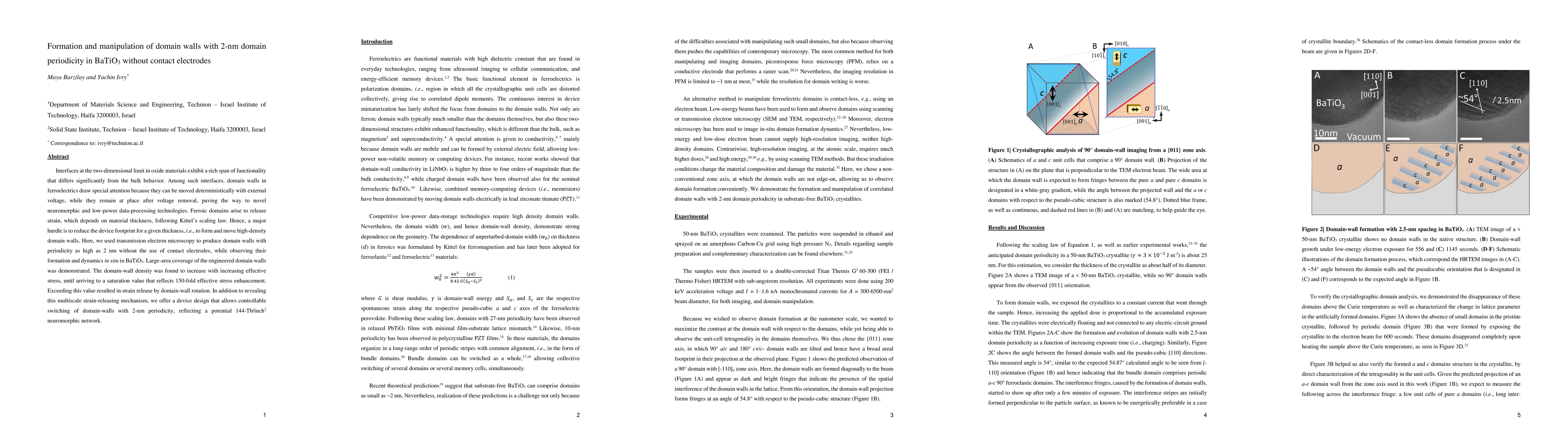Interfaces at the two-dimensional limit in oxide materials exhibit a rich span of functionality that differs significantly from the bulk behavior. Among such interfaces, domain walls in ferroelectrics draw special attention because they can be moved deterministically with external voltage, while they remain at place after voltage removal, paving the way to novel neuromorphic and low-power data-processing technologies. Ferroic domains arise to release strain, which depends on material thickness, following Kittel scaling law. Hence, a major hurdle is to reduce the device footprint for a given thickness, i.e., to form and move high-density domain walls. Here, we used transmission electron microscopy to produce domain walls with periodicity as high as 2 nm without the use of contact electrodes, while observing their formation and dynamics in situ in $BaTiO_3$. Large-area coverage of the engineered domain walls was demonstrated. The domain-wall density was found to increase with increasing effective stress, until arriving to a saturation value that reflects 150-fold effective stress enhancement. Exceeding this value resulted in strain release by domain-wall rotation. In addition to revealing this multiscale strain-releasing mechanism, we offer a device design that allows controllable switching of domain-walls with 2-nm periodicity, reflecting a potential $144-Tb/inch^2$ neuromorphic network.