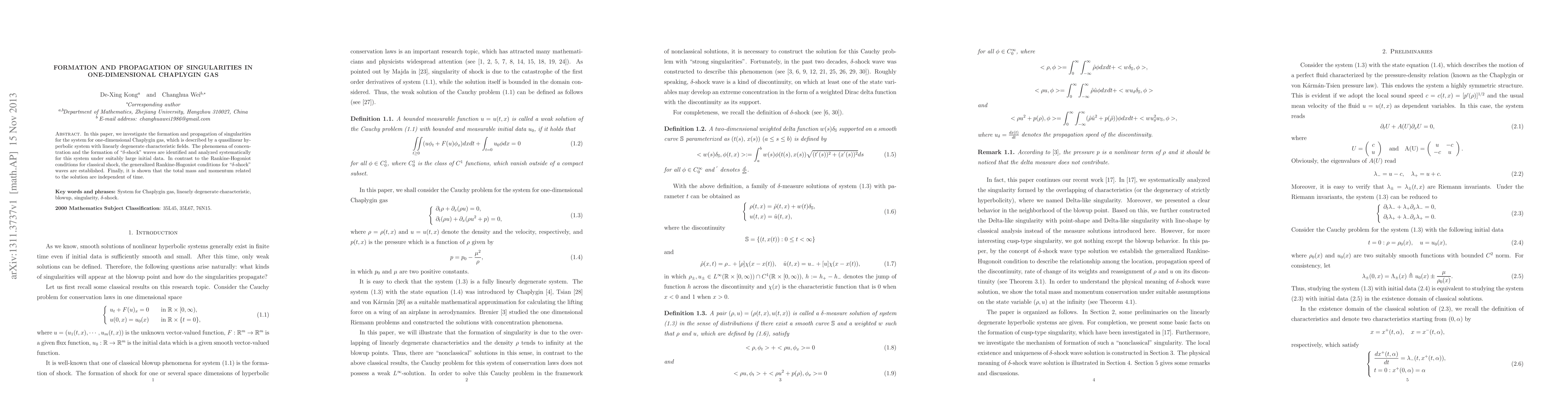 In this paper, we investigate the formation and propagation of singularities for the system for one-dimensional Chaplygin gas, which is described by a quasilinear hyperbolic system with linearly degenerate characteristic fields. The phenomena of concentration and the formation of ``$\delta$-shock'' waves are identified and analyzed systematically for this system under suitably large initial data. In contrast to the Rankine-Hogoniot conditions for classical shock, the generalized Rankine-Hogoniot conditions for ``$\delta$-shock'' waves are established. Finally, it is shown that the total mass and momentum related to the solution are independent of time.