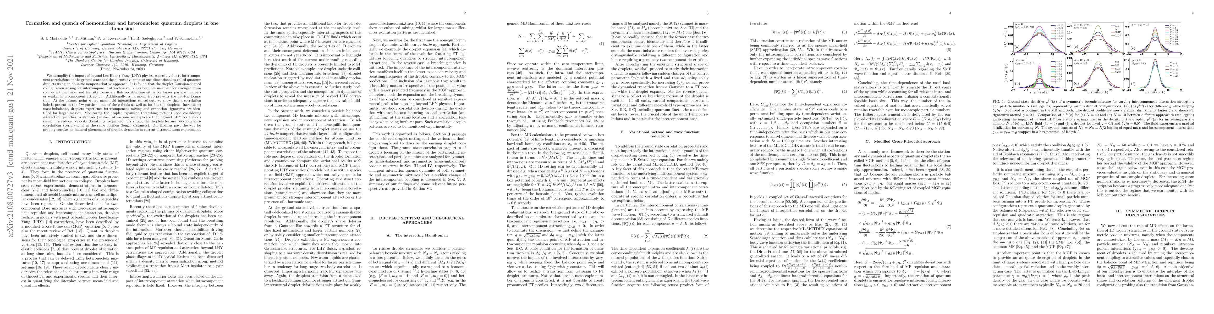 We exemplify the impact of beyond Lee-Huang-Yang (LHY) physics, especially due to intercomponent correlations, in the ground state and the quench dynamics of one-dimensional so-called quantum droplets using an ab-initio nonperturbative approach. It is found that the droplet Gaussian-shaped configuration arising for intercomponent attractive couplings becomes narrower for stronger intracomponent repulsion and transits towards a flat-top structure either for larger particle numbers or weaker intercomponent attraction. Additionally, a harmonic trap prevents the flat-top formation. At the balance point where mean-field interactions cancel out, we show that a correlation hole is present in the few particle limit of these fluids as well as for flat-top droplets. Introducing mass-imbalance, droplets experience intercomponent mixing and excitation signatures are identified for larger masses. Monitoring the droplet expansion (breathing motion) upon considering interaction quenches to stronger (weaker) attractions we explicate that beyond LHY correlations result in a reduced velocity (breathing frequency). Strikingly, the droplets feature two-body anti-correlations (correlations) at the same position (longer distances). Our findings pave the way for probing correlation-induced phenomena of droplet dynamics in current ultracold atom experiments.