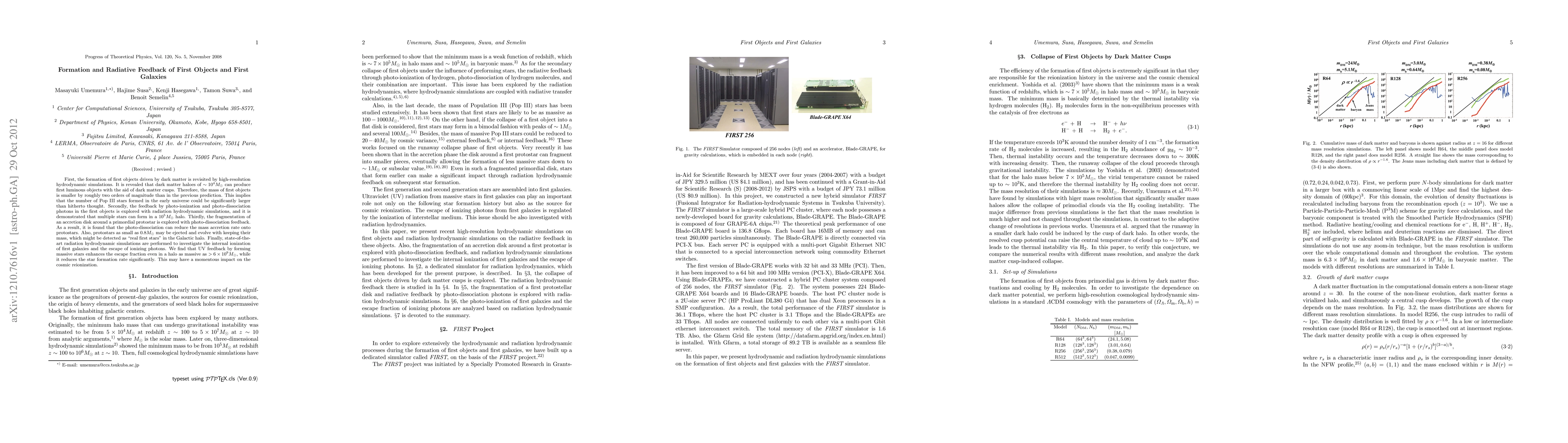First, the formation of first objects driven by dark matter is revisited by high-resolution hydrodynamic simulations. It is revealed that dark matter haloes of ~10^4M_sun can produce first luminous objects with the aid of dark matter cusps. Therefore, the mass of first objects is smaller by roughly two orders of magnitude than in the previous prediction. This implies that the number of Pop III stars formed in the early universe could be significantly larger than hitherto thought. Secondly, the feedback by photo-ionization and photo-dissociation photons in the first objects is explored with radiation hydrodynamic simulations, and it is demonstrated that multiple stars can form in a 10^5M_sun halo. Thirdly, the fragmentation of an accretion disk around a primordial protostar is explored with photo-dissociation feedback. As a result, it is found that the photo-dissociation can reduce the mass accretion rate onto protostars. Also, protostars as small as 0.8M_sun may be ejected and evolve with keeping their mass, which might be detected as "real first stars" in the Galactic halo. Finally, state-of-the-art radiation hydrodynamic simulations are performed to investigate the internal ionization of first galaxies and the escape of ionizing photons. We find that UV feedback by forming massive stars enhances the escape fraction even in a halo as massive as > 6* 10^9M_sun, while it reduces the star formation rate significantly. This may have a momentous impact on the cosmic reionization.