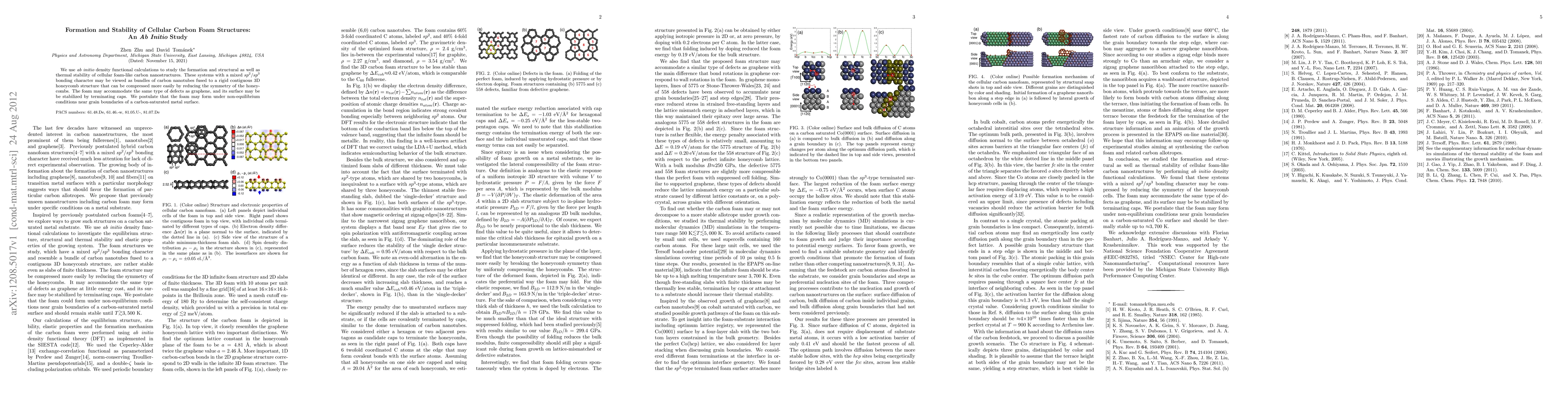 This study uses ab initio density functional calculations to explore the formation and stability of cellular carbon foam structures, revealing their mixed $sp^2/sp^3$ bonding and potential for easy compression. The foam, akin to bundles of fused carbon nanotubes, may form under non-equilibrium conditions near metal grain boundaries.