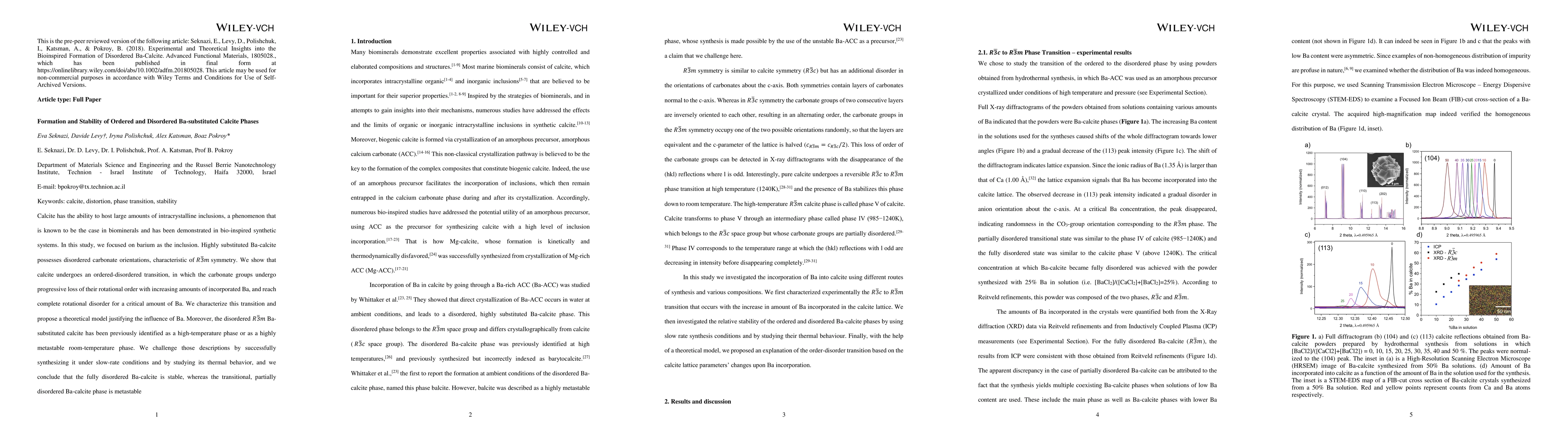 Calcite has the ability to host large amounts of intracrystalline inclusions, a phenomenon that is known to be the case in biominerals and has been demonstrated in bio-inspired synthetic systems. In this study, we focused on barium as the inclusion. Highly substituted Ba-calcite possesses disordered carbonate orientations, characteristic of R-3m symmetry. We show that calcite undergoes an ordered-disordered transition, in which the carbonate groups undergo progressive loss of their rotational order with increasing amounts of incorporated Ba, and reach complete rotational disorder for a critical amount of Ba. We characterize this transition and propose a theoretical model justifying the influence of Ba. Moreover, the disordered R-3m Ba-substituted calcite has been previously identified as a high-temperature phase or as a highly metastable room-temperature phase. We challenge those descriptions by successfully synthesizing it under slow-rate conditions and by studying its thermal behavior, and we conclude that the fully disordered Ba-calcite is stable, whereas the transitional, partially disordered Ba-calcite phase is metastable.