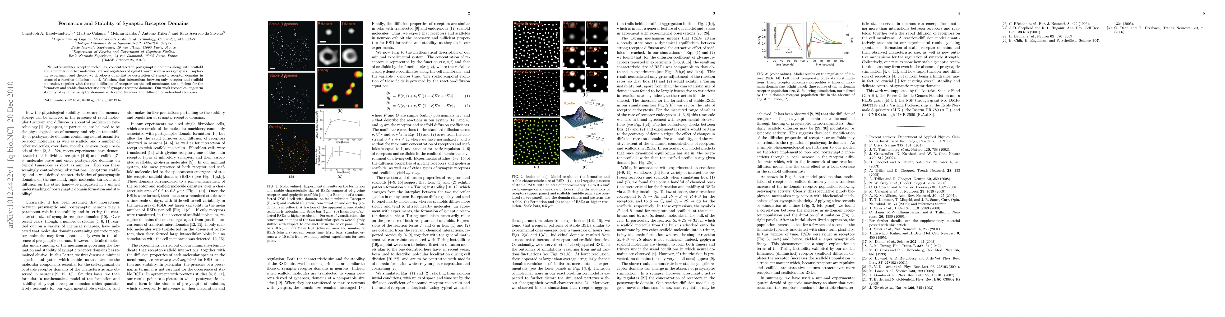 This paper quantitatively describes synaptic receptor domains using a reaction-diffusion model, demonstrating that interactions between receptors and scaffold molecules, along with receptor diffusion, are sufficient for domain formation and stability, reconciling rapid receptor turnover with long-term domain stability.