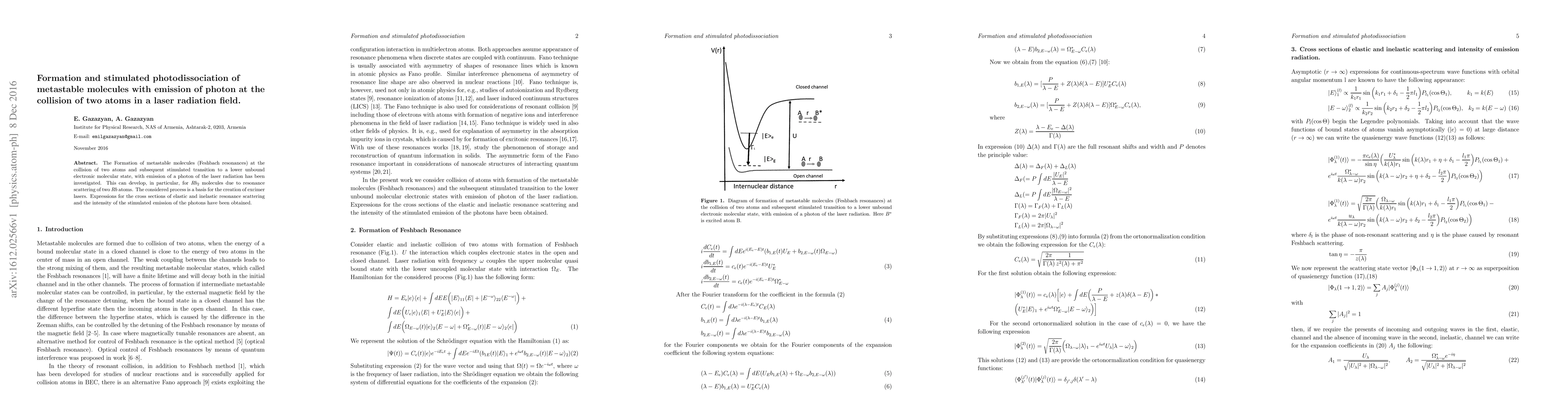 The Formation of metastable molecules (Feshbach resonances) at the collision of two atoms and subsequent stimulated transition to a lower unbound electronic molecular state, with emission of a photon of the laser radiation has been investigated. This can develop, in particular, for $Rb_2$ molecules due to resonance scattering of two $Rb$ atoms. The considered process is a basis for the creation of excimer lasers. Expressions for the cross sections of elastic and inelastic resonance scattering and the intensity of the stimulated emission of the photons have been obtained.