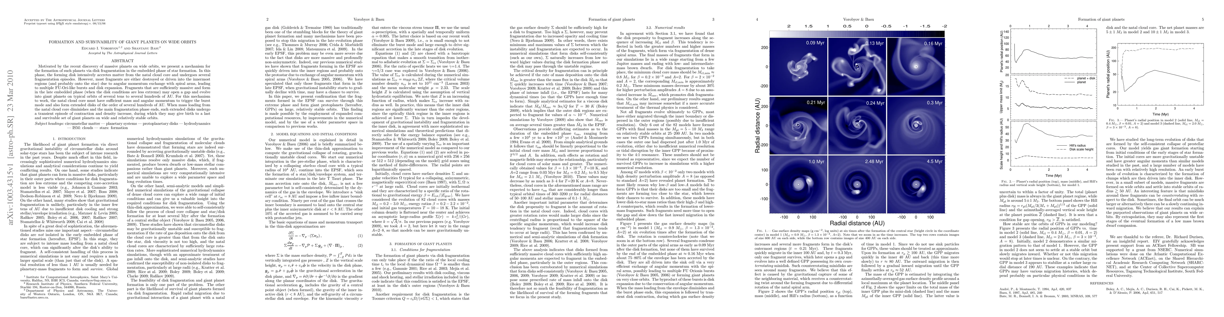 This paper proposes a mechanism for the formation of giant planets on wide orbits through disk fragmentation during the embedded phase of star formation. Surviving fragments, formed in the late embedded phase, evolve into stable giant planets on orbits spanning several tens to hundreds of AU.