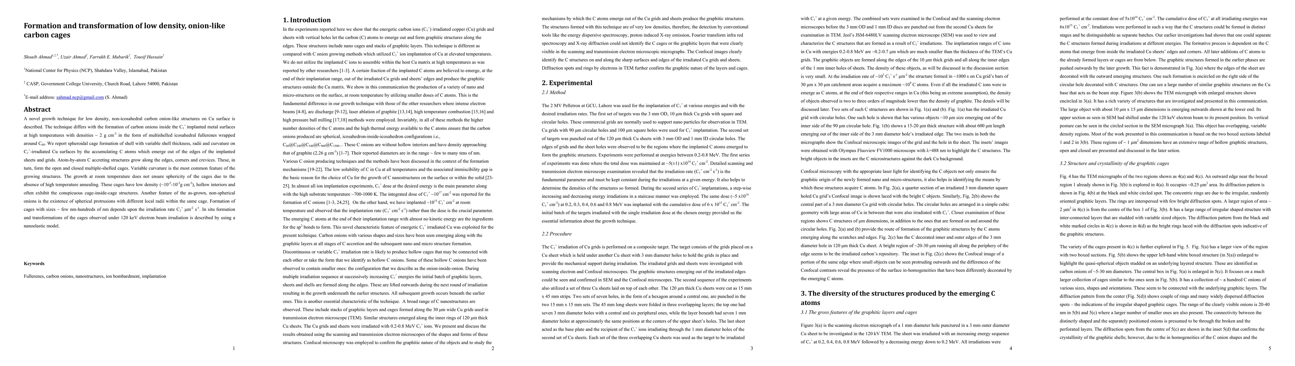 This paper describes a novel growth technique for low density, non-icosahedral carbon onion-like structures on Cu surfaces, revealing the formation of spheroidal cages through C atom accumulation and transformation under high-temperature C1+ implantation, with variable shell properties and in situ transformations observed under electron beam irradiation.