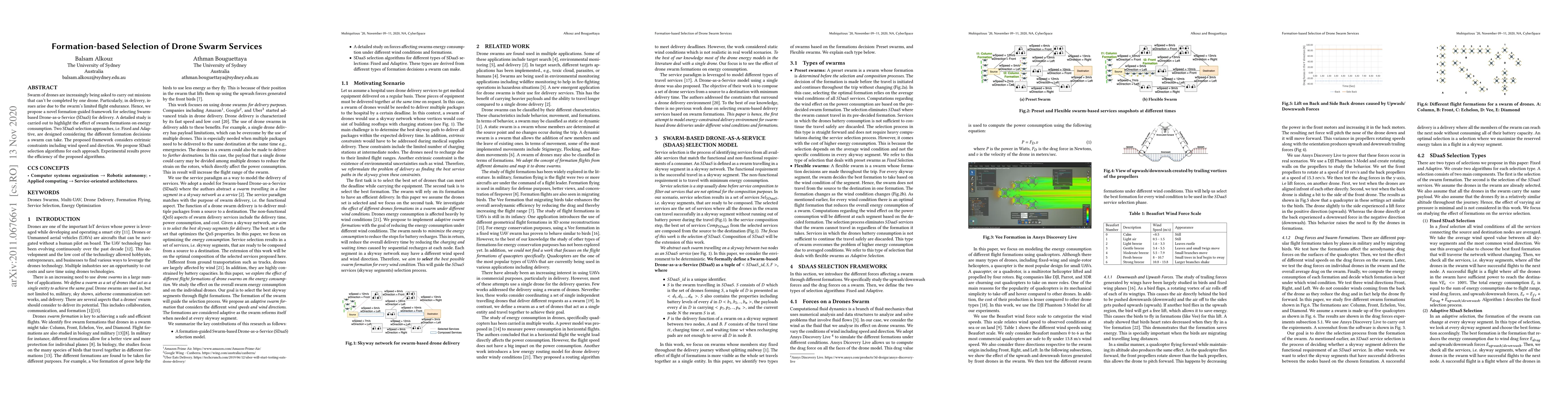 Swarm of drones are increasingly being asked to carry out missions that can't be completed by one drone. Particularly, in delivery, issues arise due to the swarm's limited flight endurance. Hence, we propose a novel formation-guided framework for selecting Swarm-based Drone-as-a-Service (SDaaS) for delivery. A detailed study is carried out to highlight the effect of swarm formations on energy consumption. Two SDaaS selection approaches, i.e. Fixed and Adaptive, are designed considering the different formation decisions a swarm can take. The proposed framework considers extrinsic constraints including wind speed and direction. We propose SDaaS selection algorithms for each approach. Experimental results prove the efficiency of the proposed algorithms.