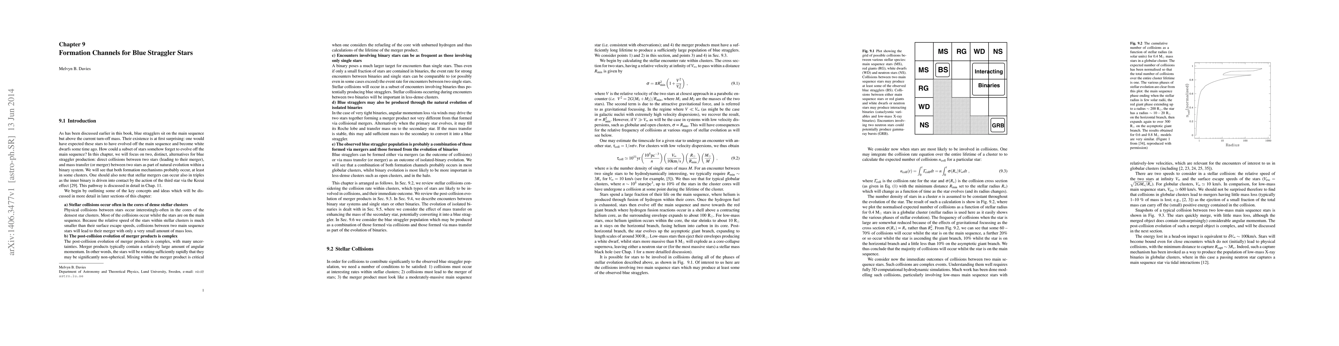 In this chapter we consider two formation channels for blue straggler stars: 1) the merger of two single stars via a collision, and 2) those produced via mass transfer within a binary. We review how computer simulations show that stellar collisions are likely to lead to relatively little mass loss and are thus effective in producing a young population of more-massive stars. The number of blue straggler stars produced by collisions will tend to increase with cluster mass. We review how the current population of blue straggler stars produced from primordial binaries decreases with increasing cluster mass. This is because exchange encounters with third, single stars in the most massive clusters tend to reduce the fraction of binaries containing a primary close to the current turn-off mass. Rather, their primaries tend to be somewhat more massive and have evolved off the main sequence, filling their Roche lobes in the past, often converting their secondaries into blue straggler stars (but more than 1 Gyr or so ago and thus they are no longer visible today as blue straggler stars).