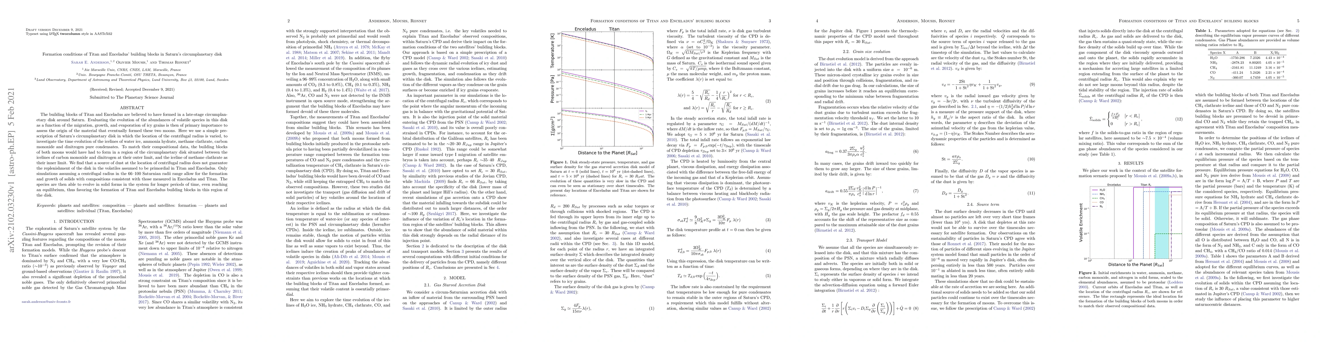 This paper investigates the formation conditions of Titan and Enceladus' building blocks in Saturn's circumplanetary disk, finding that their formation likely occurred in a region between the carbon monoxide/dinitrogen icelines and the methane clathrate iceline, specifically within the 66-100 Saturnian radii range. Simulations suggest that only in this region could the necessary volatile species evolve and maintain equilibrium over time, supporting the formation of these moons' building blocks.