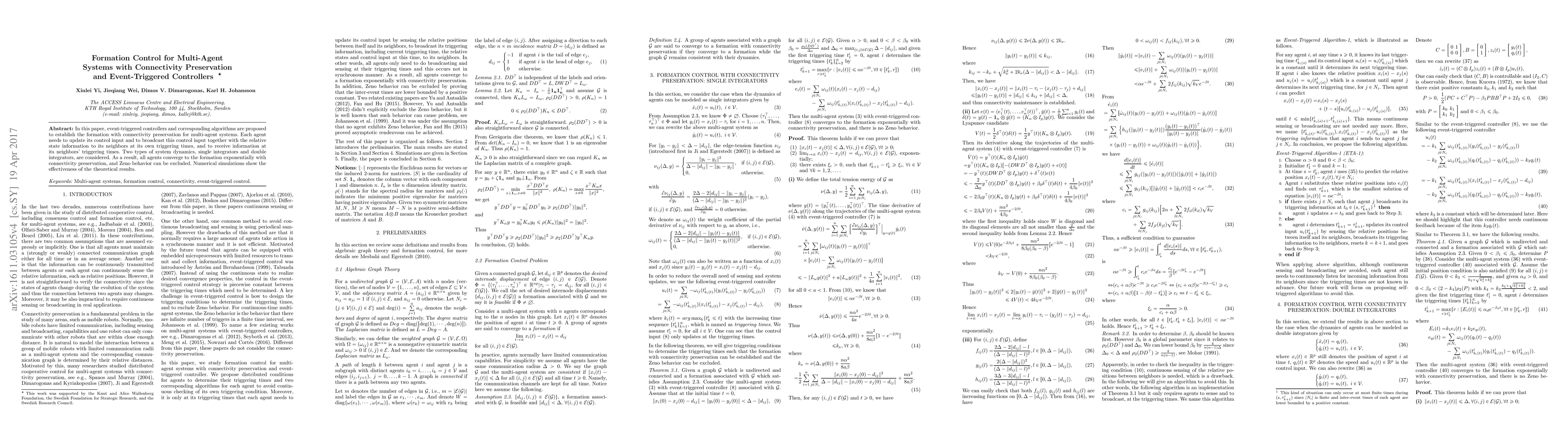 This paper proposes event-triggered controllers for multi-agent systems to maintain formation while preserving connectivity. The approach ensures exponential convergence and excludes Zeno behavior, validated through simulations for both single and double integrator dynamics.