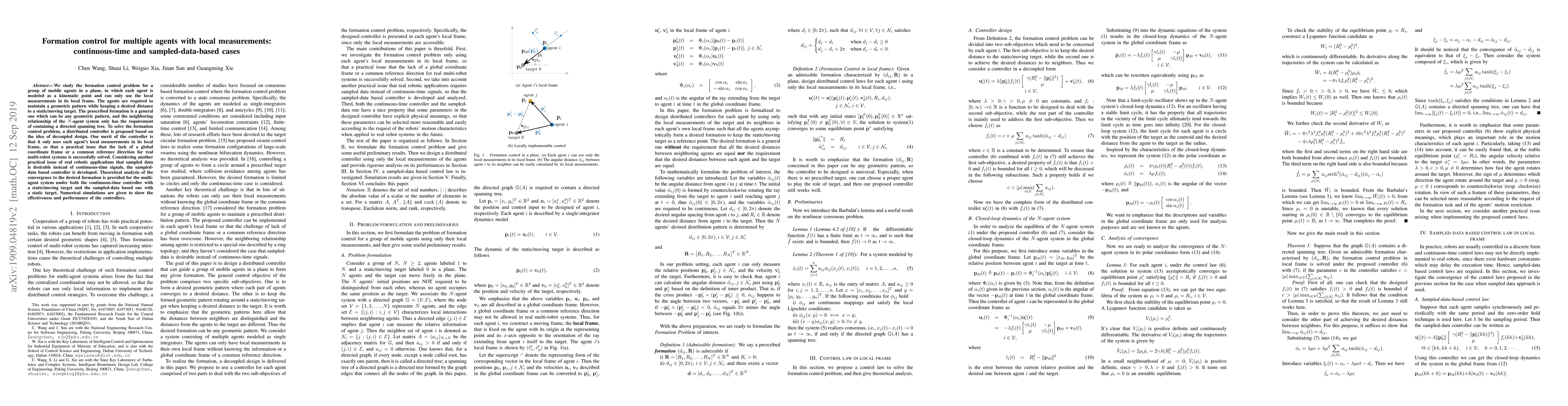 This paper proposes distributed controllers for formation control of multiple mobile agents using local measurements, addressing both continuous-time and sampled-data scenarios. The controllers ensure geometric pattern maintenance and desired distance to a target, with theoretical convergence analysis and numerical simulations validating their effectiveness.
