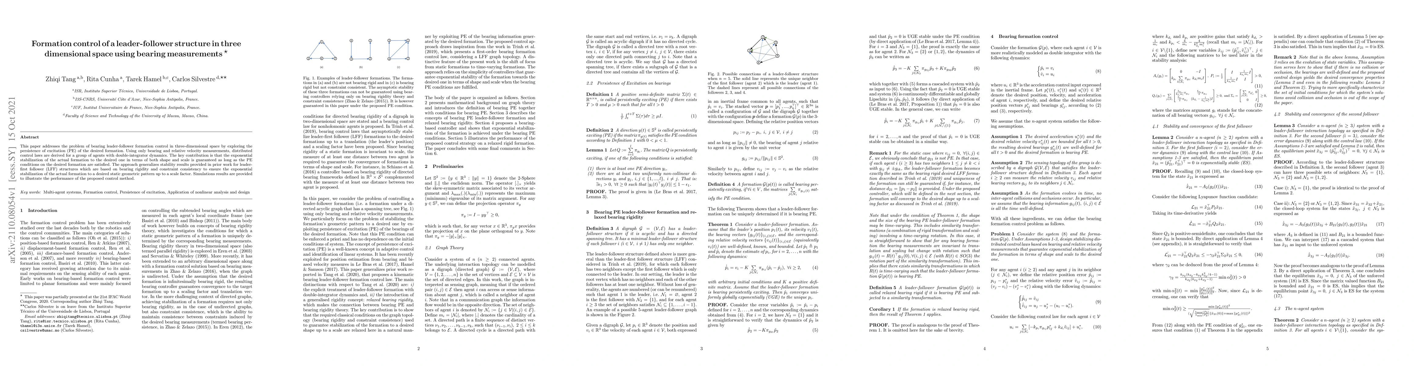 This paper addresses the problem of bearing leader-follower formation control in three-dimensional space by exploring the persistence of excitation (PE) of the desired formation. Using only bearing and relative velocity measurements, distributed control laws are derived for a group of agents with double-integrator dynamics. The key contribution is that the exponential stabilization of the actual formation to the desired one in terms of both shape and scale is guaranteed as long as the PE conditions on the desired formation are satisfied. The approach generalizes stability results provided in prior work for leader-first follower (LFF) structures which are based on bearing rigidity and constraint consistency to ensure the exponential stabilization of the actual formation to a desired static geometric pattern up to a scale factor. Simulations results are provided to illustrate the performance of the proposed control method.