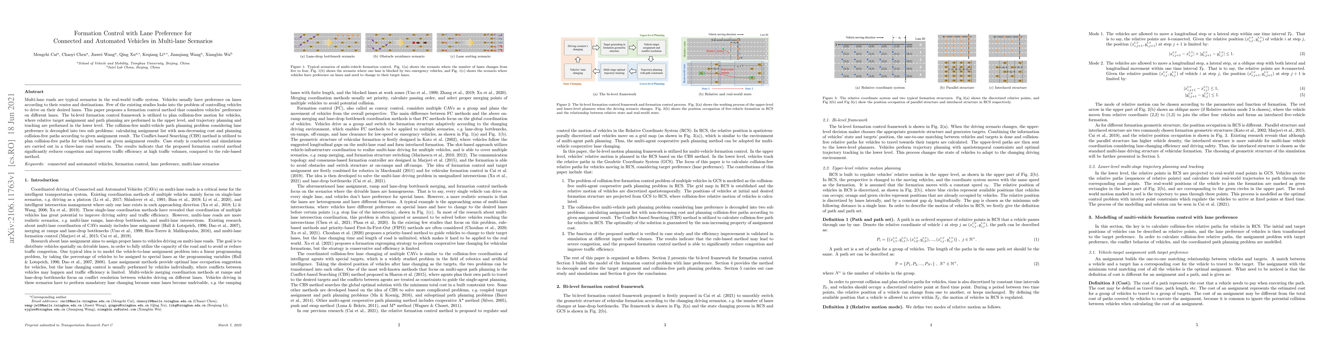 Multi-lane roads are typical scenarios in the real-world traffic system. Vehicles usually have preference on lanes according to their routes and destinations. Few of the existing studies looks into the problem of controlling vehicles to drive on their desired lanes. This paper proposes a formation control method that considers vehicles' preference on different lanes. The bi-level formation control framework is utilized to plan collision-free motion for vehicles, where relative target assignment and path planning are performed in the upper level, and trajectory planning and tracking are performed in the lower level. The collision-free multi-vehicle path planning problem considering lane preference is decoupled into two sub problems: calculating assignment list with non-decreasing cost and planning collision-free paths according to given assignment result. The Conflict-based Searching (CBS) method is utilized to plan collision-free paths for vehicles based on given assignment results. Case study is conducted and simulations are carried out in a three-lane road scenario. The results indicate that the proposed formation control method significantly reduces congestion and improves traffic efficiency at high traffic volumes, compared to the rule-based method.