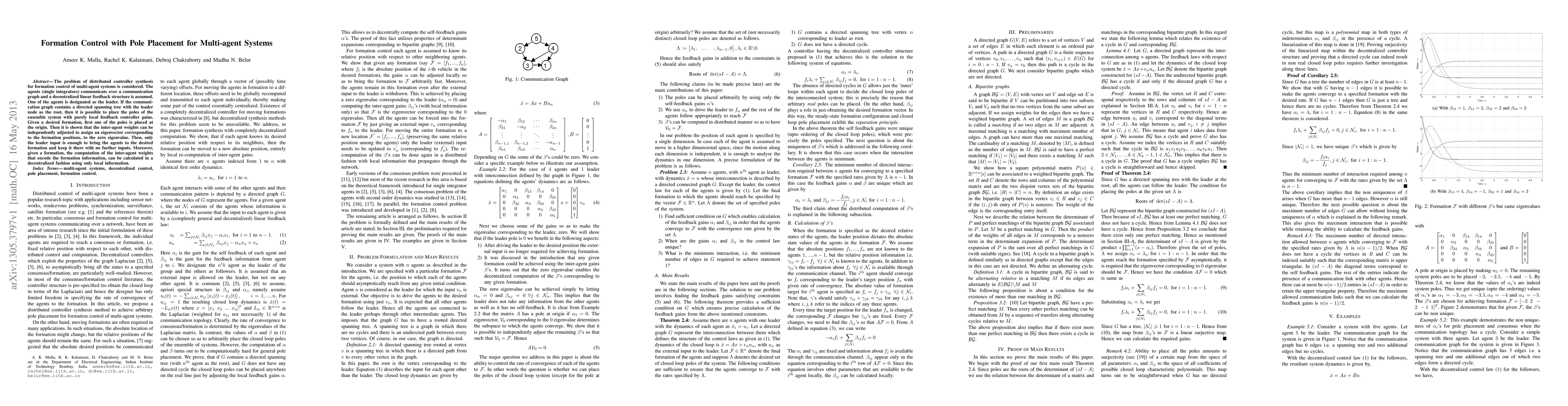 This paper addresses formation control for multi-agent systems using decentralized linear feedback. It demonstrates that if the communication graph includes a directed spanning tree with the leader as the root, the poles of the ensemble system can be placed with purely local feedback, enabling the agents to achieve and maintain a desired formation.