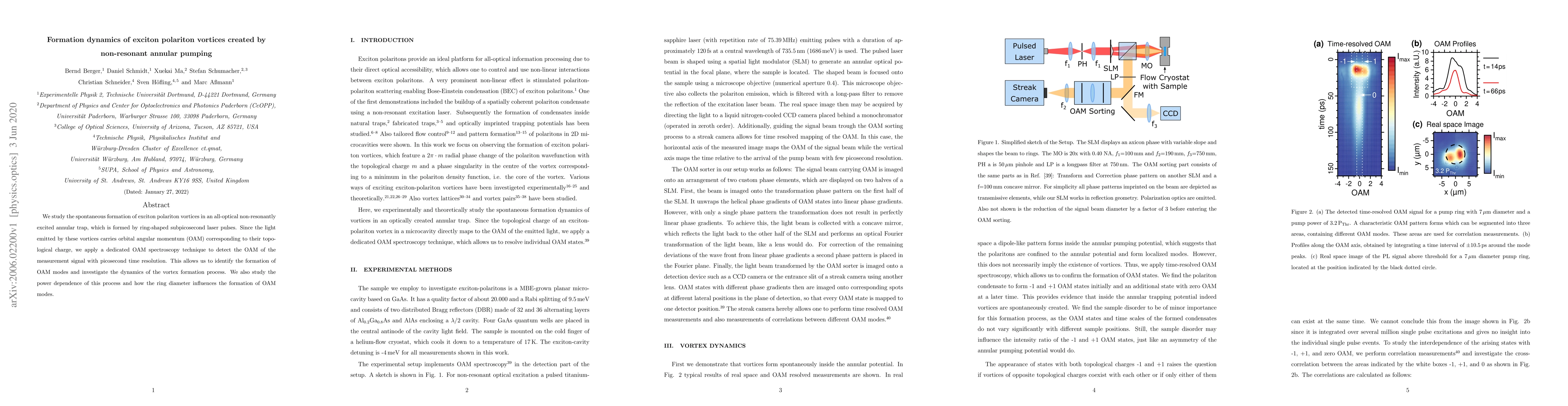 The study investigates the formation dynamics of exciton polariton vortices using non-resonant annular pumping. It employs an OAM spectroscopy technique for high-resolution detection of orbital angular momentum (OAM) modes with picosecond time resolution.