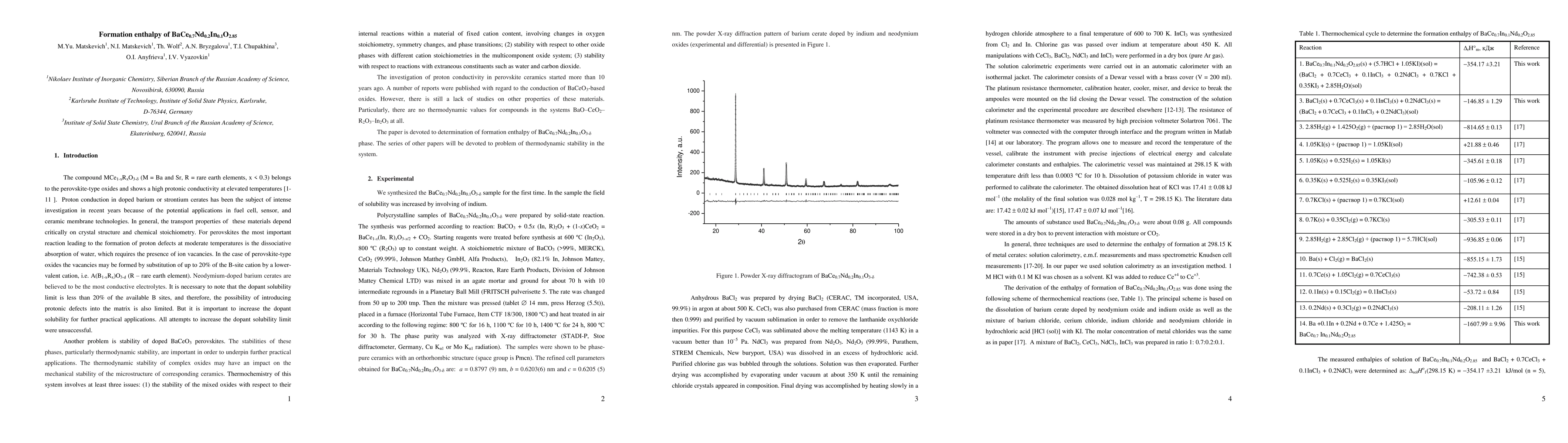 In this paper for the first time we synthesized the compound BaCe0.7Nd0.2In0.1O2.85 by solid-state reaction. The phase has orthorhombic structure (space group Pmcn). We also measured the standard formation enthalpies of BaCe0.7Nd0.2In0.1O2.85 by solution calorimetry in 1 M HCl with 0.1 M KI. We determined the stability of Nd(In)-doped barium cerate with respect to mixtures of binary oxides. On the basis of these data we established that above-mentioned mixed oxide is thermodynamically stable with respect to their decomposition into binary oxides at room temperatures. We also established that BaCe0.7Nd0.2In0.1O2.85 oxide is thermodynamically favoured than BaCe0.8Nd0.2O2.9.