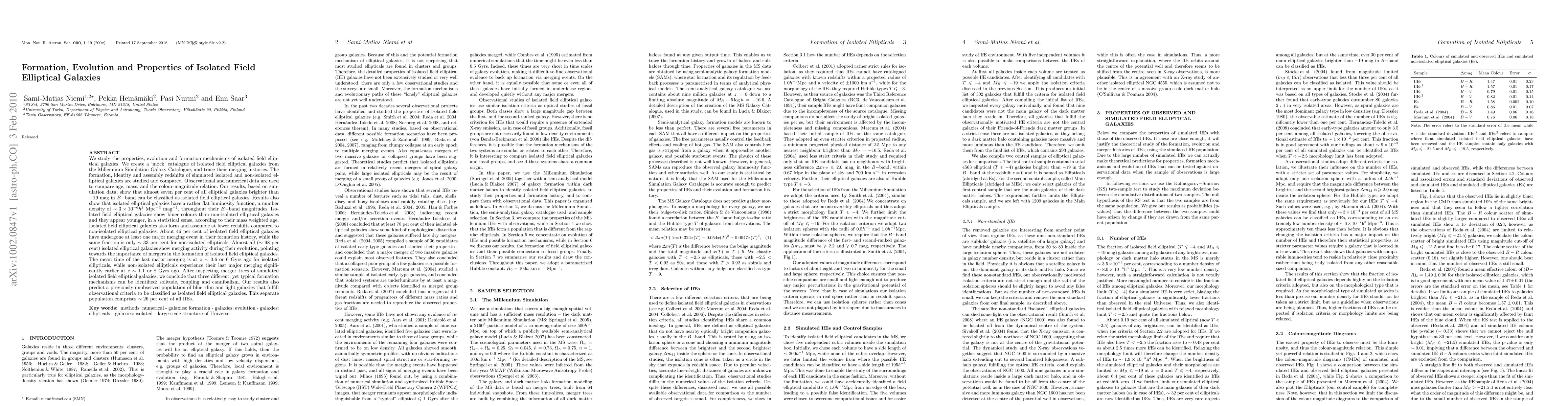 This paper investigates the formation, evolution, and properties of isolated field elliptical galaxies using a mock catalogue from the Millennium Simulation Galaxy Catalogue. It finds that isolated field elliptical galaxies are younger, bluer, and form at lower redshifts compared to non-isolated elliptical galaxies, with a distinct population comprising about 26% of all isolated field elliptical galaxies.