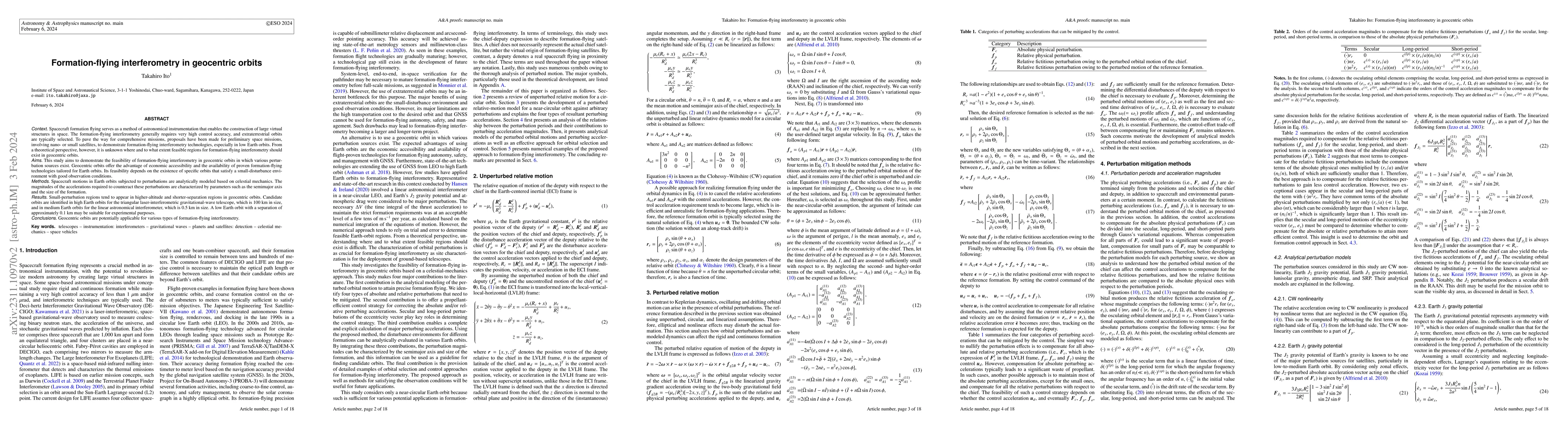 Spacecraft formation flying serves as a method of astronomical instrumentation that enables the construction of large virtual structures in space. The formation-flying interferometry generally requires very-high control accuracy, and beyond-Earth orbits are typically selected. By contrast, this study proposes the use of geocentric orbits for formation-flying interferometry. A geocentric orbit is beneficial because of its economic accessibility and the availability of flight-proven technologies for formation-flying autonomy, safety, and management. Its feasibility depends on the existence of specific orbits that satisfy a small-disturbance environment with favorable observation conditions. This theory, developed based on celestial mechanics, indicates that small-perturbation regions tend to appear in higher-altitude and shorter-separation regions. Candidate orbits are identified in high Earth orbit for the triangular laser-interferometric gravitational-wave telescope, which is 100 km in size, and in medium Earth orbit for the linear astronomical interferometer, which is 0.5 km in size. A low Earth orbit with a separation of approximately 0.1 km may be suitable for experimental purposes. As shown in these examples, geocentric orbits are potentially applicable for various types of formation-flying interferometry.