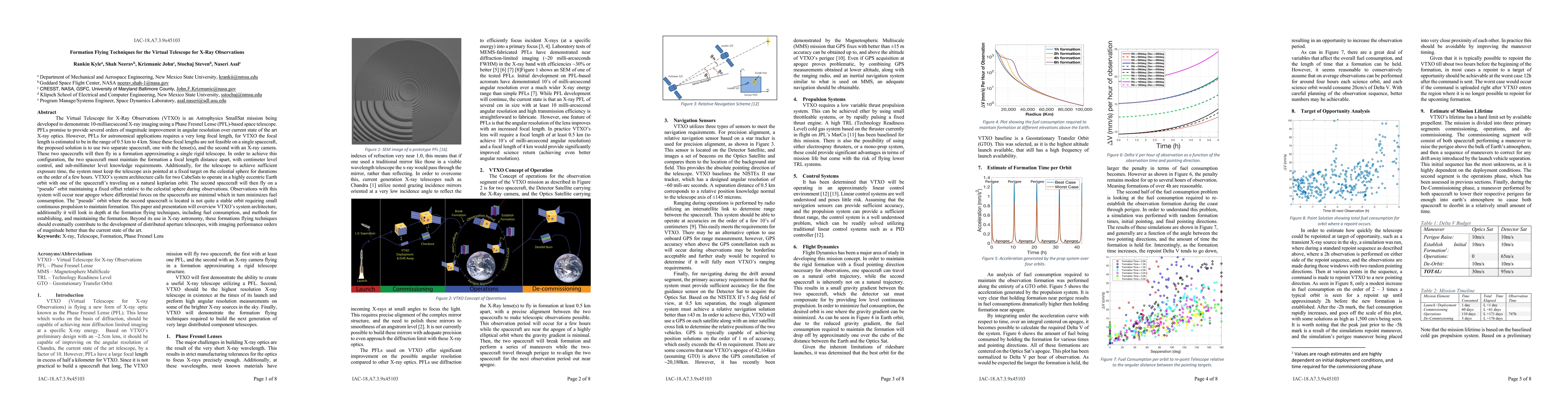 The Virtual Telescope for X-Ray Observations (VTXO) is an Astrophysics SmallSat mission being developed to demonstrate 10-milliarcsecond X-ray imaging using a Phase Fresnel Lense (PFL) based space telescope. PFLs promise to provide several orders of magnitude improvement in angular resolution over current state of the art X-ray optics. However, PFLs for astronomical applications require a long focal length, for VTXO the focal length is estimated to be in the range of 0.5 km to 4 km. Since these focal lengths are not feasible on a single spacecraft, the proposed solution is to use two separate spacecraft, one with the lense(s), and the second with an X-ray camera. These two spacecrafts will then fly in a formation approximating a single rigid telescope. In order to achieve this configuration, the two spacecraft must maintain the formation a focal length distance apart, with centimeter level control, and sub-millimeter level knowledge requirements. Additionally, the system must keep the telescope axis pointed at a fixed target on the celestial sphere for extended durations. VTXOs system architecture calls for two CubeSats to operate in a highly eccentric Earth orbit with one of the spacecrafts traveling on a natural keplarian orbit. The second spacecraft will then fly on a pseudo orbit maintaining a fixed offset during observations. Observations with this system will occur near apogee where differential forces on the spacecrafts are minimal which in turn minimizes fuel consumption. This paper overviews VTXOs system architecture, and looks in depth at the formation flying techniques, including fuel consumption, and methods maintaining the formation. Beyond its use in X-ray astronomy, these formations flying techniques should eventually contribute to the development of distributed aperture telescopes, with imaging performance orders of magnitude better than the current state of the art.