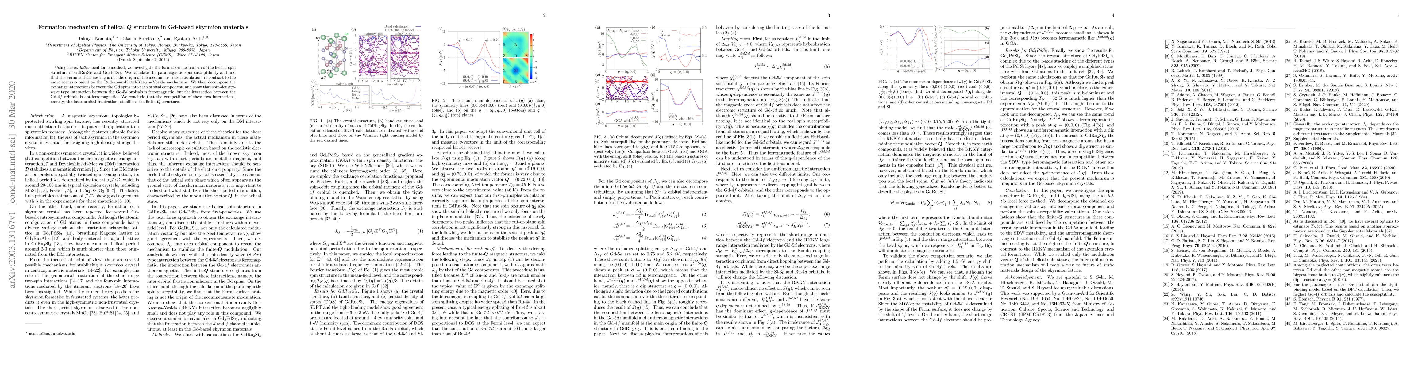 Using the ab initio local force method, we investigate the formation mechanism of the helical spin structure in GdRu$_2$Si$_2$ and Gd$_2$PdSi$_3$. We calculate the paramagnetic spin susceptibility and find that the Fermi surface nesting is not the origin of the incommensurate modulation, in contrast to the naive scenario based on the Ruderman-Kittel-Kasuya-Yosida mechanism. We then decompose the exchange interactions between the Gd spins into each orbital component, and show that spin-density-wave type interaction between the Gd-5$d$ orbitals is ferromagnetic, but the interaction between the Gd-4$f$ orbitals is antiferromagnetic. We conclude that the competition of these two interactions, namely, the inter-orbital frustration, stabilizes the finite-Q structure.