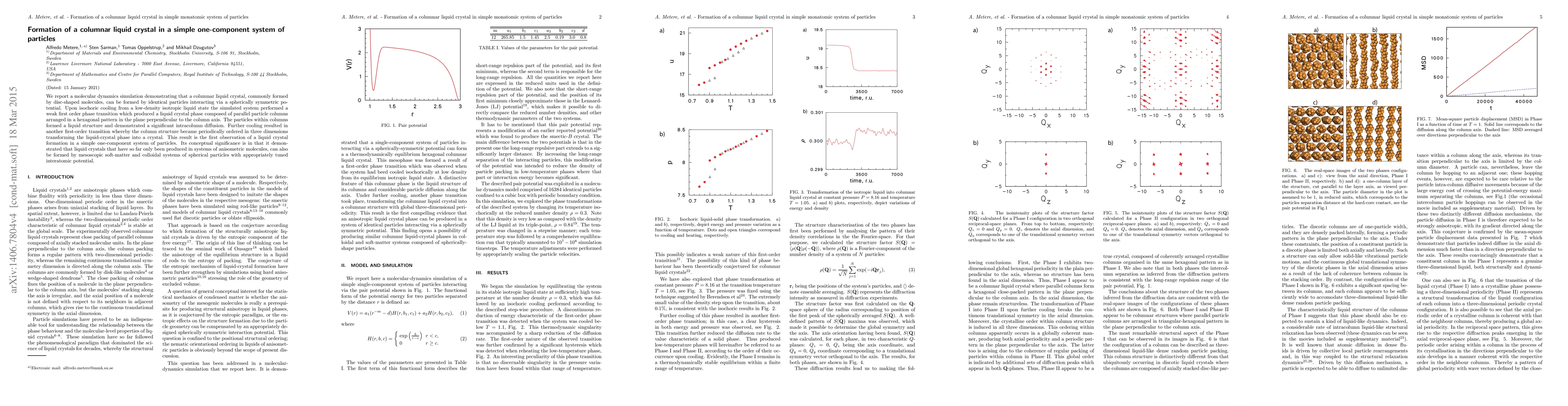 This research demonstrates through molecular dynamics simulation that a columnar liquid crystal phase can emerge in a simple one-component system of identical particles interacting via a spherically symmetric potential. The system undergoes a phase transition to form a liquid crystal with parallel particle columns arranged in a hexagonal pattern, showing significant intracolumn diffusion.