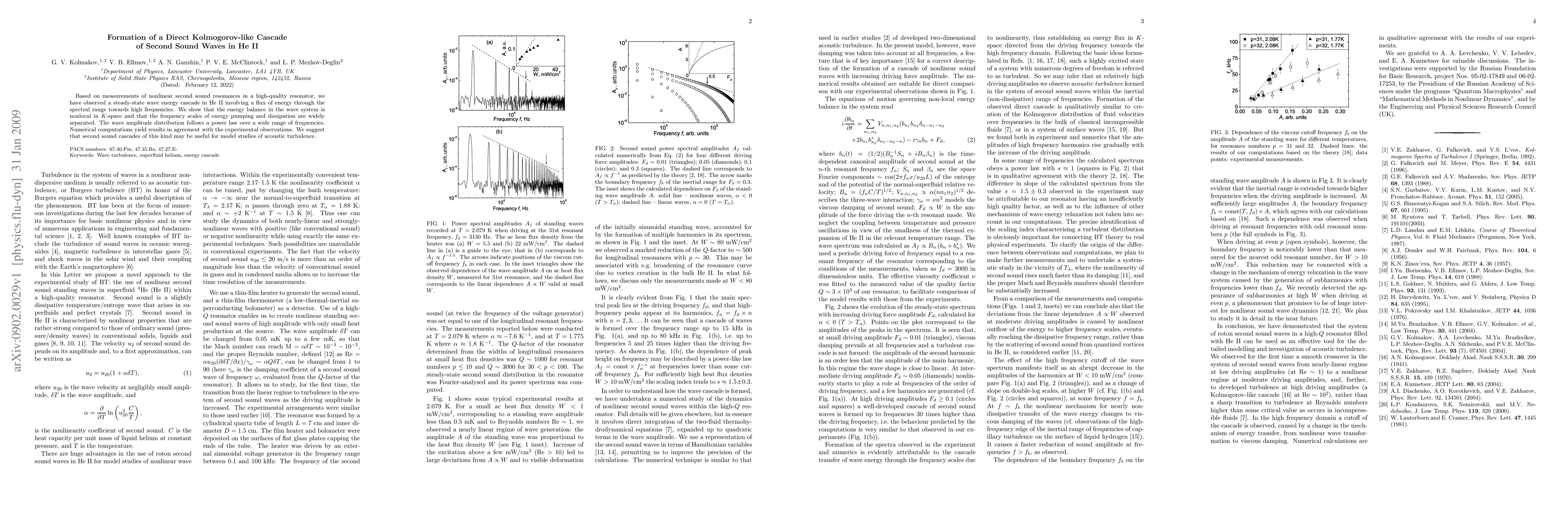 This study observes a direct Kolmogorov-like cascade in second sound waves in He II, characterized by a nonlocal energy balance in K-space and a power law wave amplitude distribution. Numerical simulations confirm the experimental findings, suggesting potential applications in modeling acoustic turbulence.