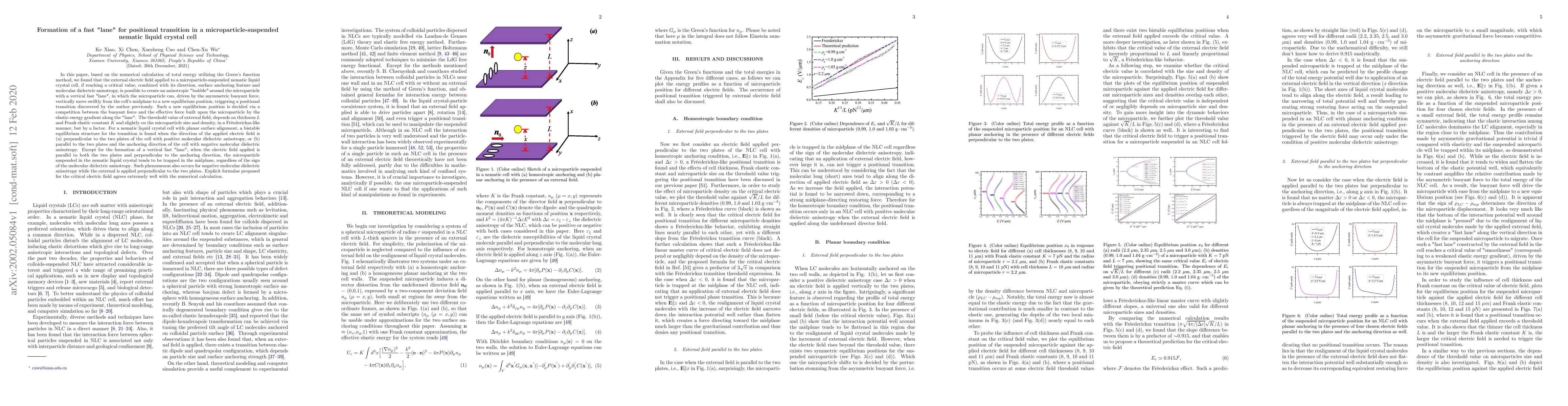 In this paper, based on the numerical calculation of total energy utilizing the Green's function method, we found that the external electric field applied to a microparticle-suspended nematic liquid crystal cell, if reaching a critical value, combined with its direction, surface anchoring feature and molecular dielectric anisotropy, is possible to create an anisotropic "bubble" around the microparticle with a vertical fast "lane", in which the microparticle can, driven by the asymmetric buoyant force, vertically move swiftly from the cell's midplane to a new equilibrium position, triggering a positional transition discovered by the author previously. Such a new equilibrium position is decided via a competition between the buoyant force and the effective force built upon the microparticle by the elastic energy gradient along the "lane". The threshold value of external field, depends on thickness $L$ and Frank elastic constant $K$ and slightly on the microparticle size and density, in a Fr\'{e}edericksz-like manner, but by a factor. For a nematic liquid crystal cell with planar surface alignment, a bistable equilibrium structure for the transition is found when the direction of the applied electric field is (a) perpendicular to the two plates of the cell with positive molecular dielectric anisotropy, or (b) parallel to the two plates and the anchoring direction of the cell with negative molecular dielectric anisotropy. Except for the formation of a vertical fast "lane", when the electric field applied is parallel to both the two plates and perpendicular to the anchoring direction, the microparticle suspended in the nematic liquid crystal tends to be trapped in the midplane, regardless of the sign of the molecular dielectric anisotropy. Such phenomenon also occurs for negative molecular dielectric anisotropy while the external is applied perpendicular to the two plates.