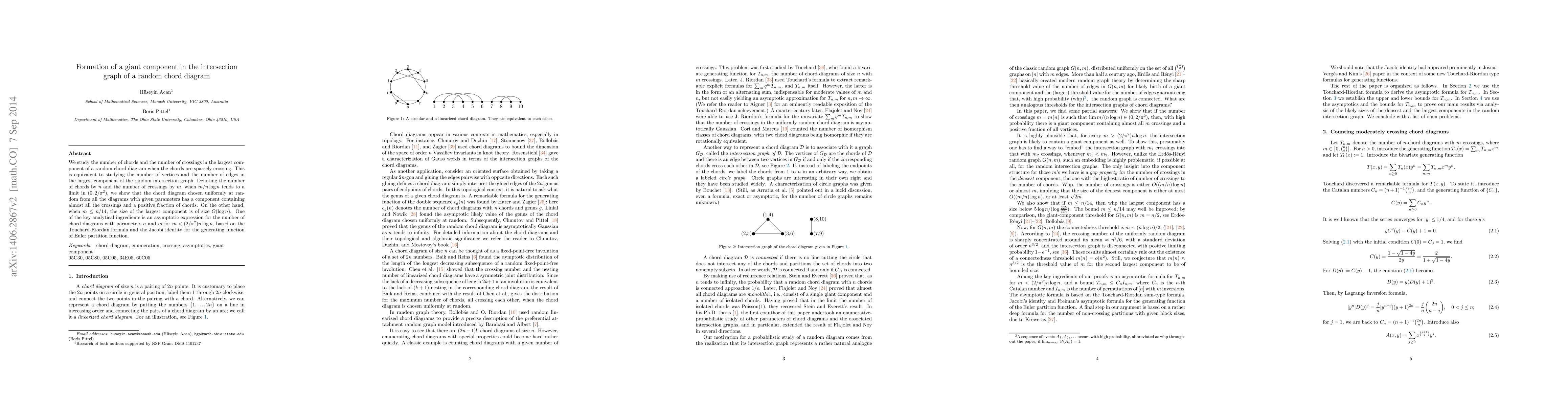 This paper investigates the formation of a giant component in the intersection graph of a random chord diagram, focusing on the number of chords and crossings. It demonstrates that when the ratio of crossings to chords tends to a limit in a specific range, the largest component contains almost all crossings and a positive fraction of chords. Conversely, when crossings are sparse, the largest component size is logarithmic. The analysis employs advanced combinatorial techniques to derive the asymptotic number of chord diagrams.