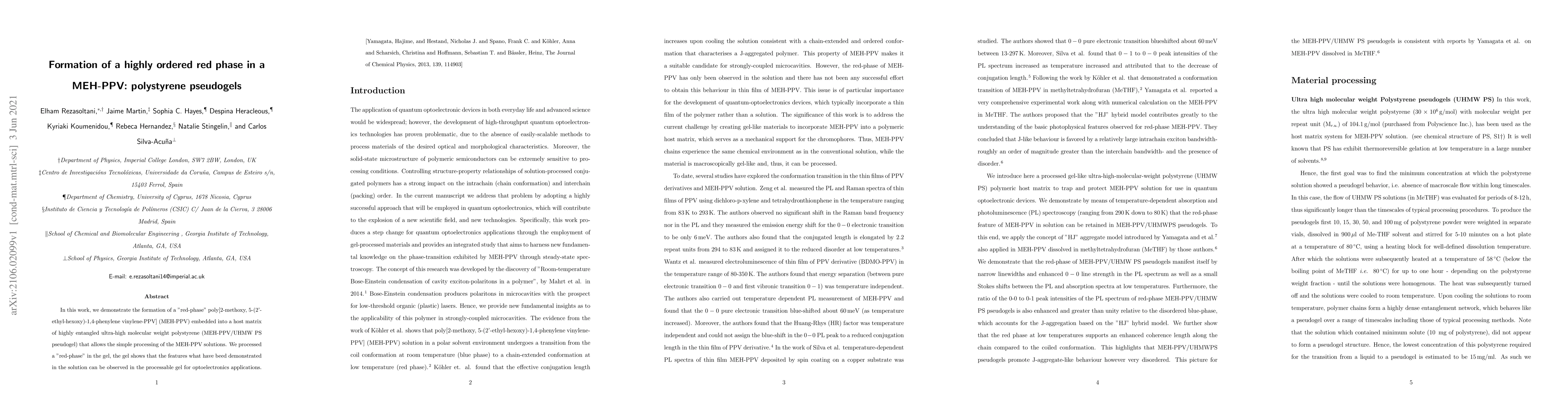 This research demonstrates the formation of a highly ordered "red-phase" in MEH-PPV embedded within a polystyrene pseudogel, enabling simple processing of MEH-PPV solutions for optoelectronics. The gel maintains the solution's features, indicating potential for practical applications.
