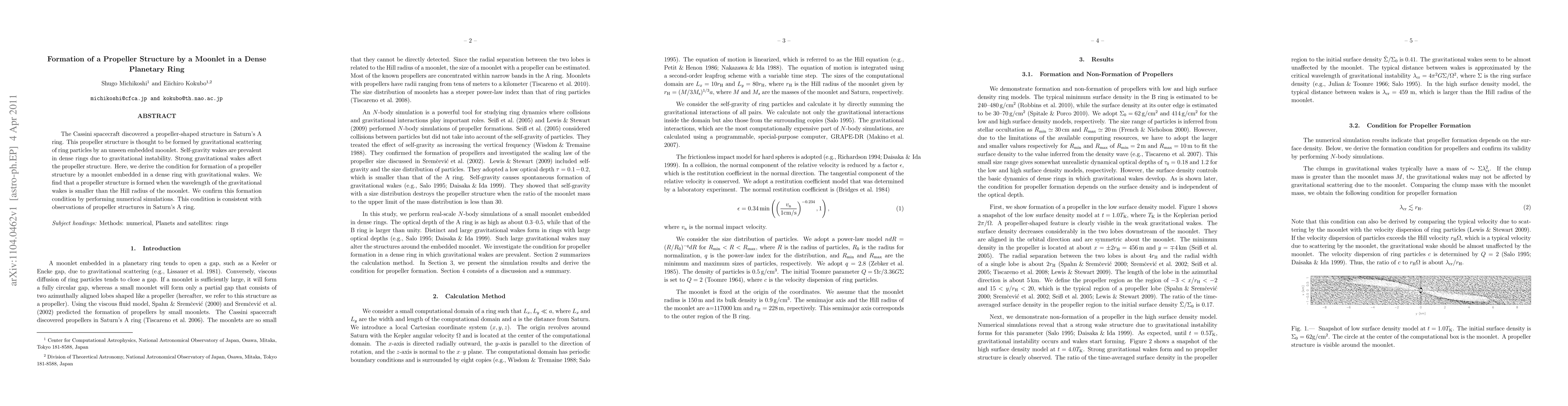 The paper derives the condition for a moonlet to form a propeller structure in Saturn's A ring through gravitational scattering, finding that it occurs when gravitational wake wavelengths are smaller than the moonlet's Hill radius. Numerical simulations confirm this condition, aligning with observed propeller structures.