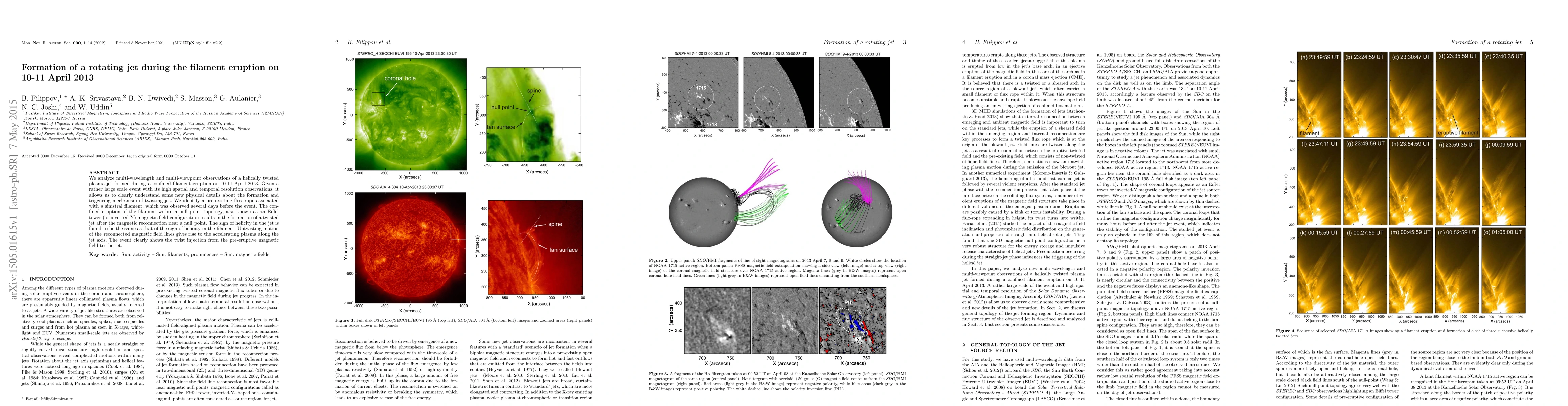 This paper analyzes a helically twisted plasma jet formed during a filament eruption on 10-11 April 2013, identifying a pre-existing flux rope and linking its twist to the jet's helicity. The eruption's magnetic reconnection near a null point results in a jet with helicity matching that of the filament.