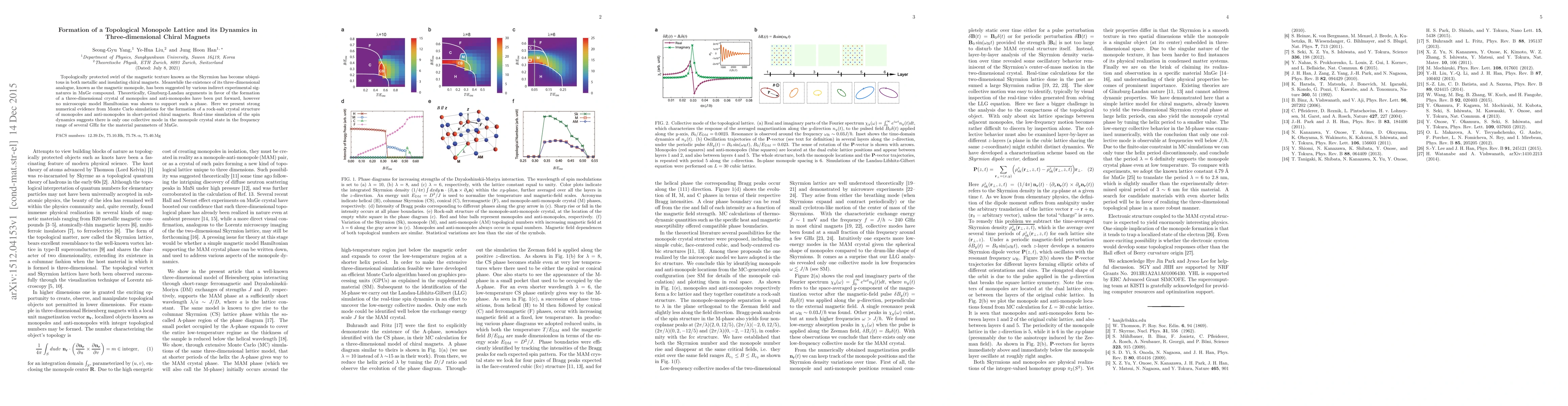 This paper presents numerical evidence from Monte Carlo simulations supporting the formation of a topological monopole lattice in three-dimensional chiral magnets, specifically in MnGe, with a rock-salt crystal structure of monopoles and anti-monopoles. Real-time spin dynamics simulations indicate a single collective mode in the monopole crystal state at frequencies in the GHz range.