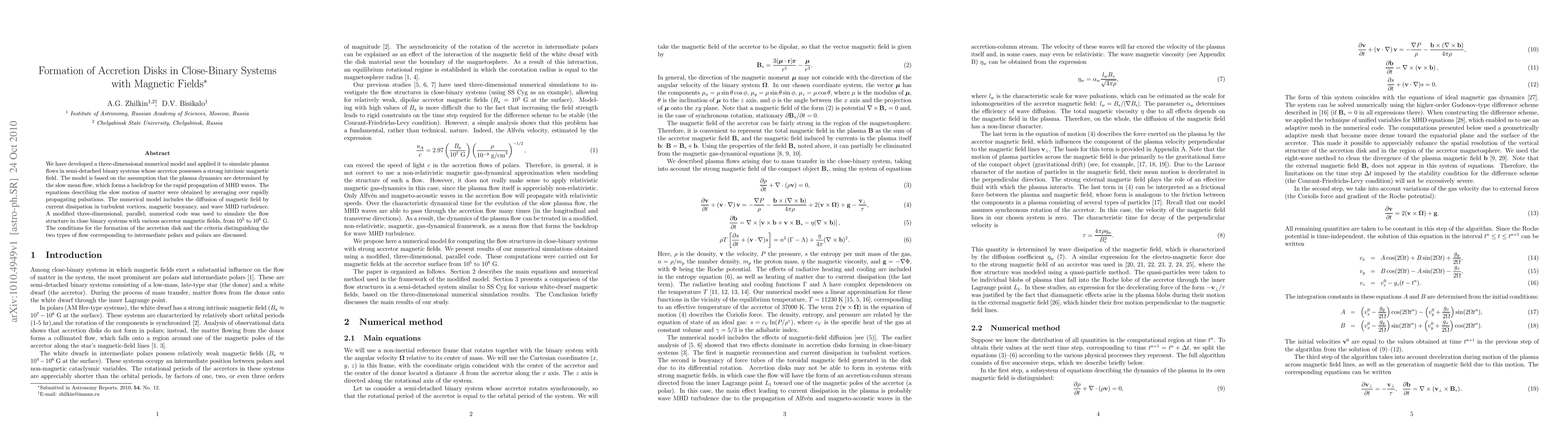 This paper develops a three-dimensional numerical model to simulate plasma flows in semi-detached binary systems with strong magnetic fields, focusing on the formation of accretion disks. The model incorporates magnetic field diffusion, magnetic buoyancy, and MHD turbulence, and it distinguishes between the flow types in intermediate polars and polars.