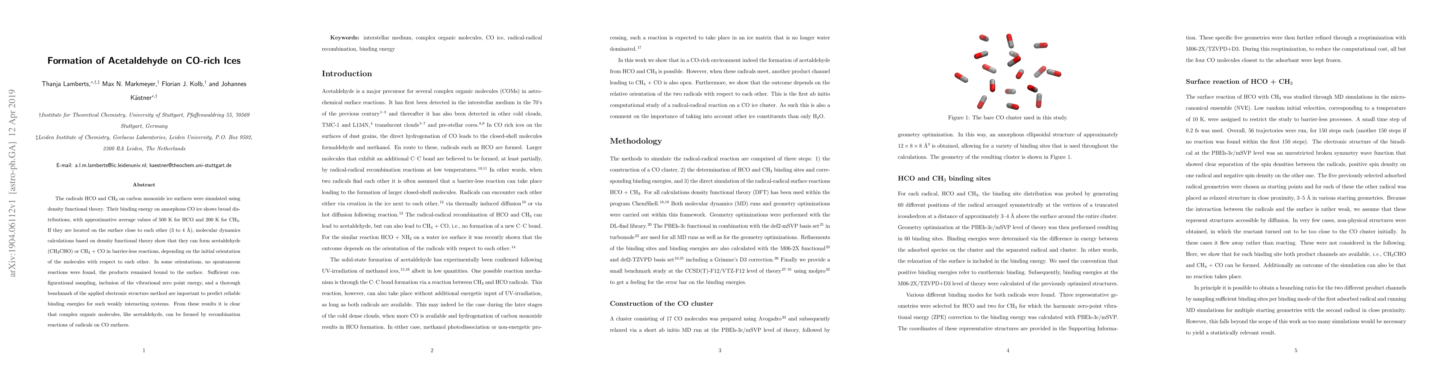 This study uses density functional theory to simulate the formation of acetaldehyde on CO-rich ices, showing that HCO and CH$_3$ radicals can react to form acetaldehyde or CH$_4$ + CO in barrier-less reactions when positioned close together. Accurate predictions require thorough sampling and consideration of zero point energy.