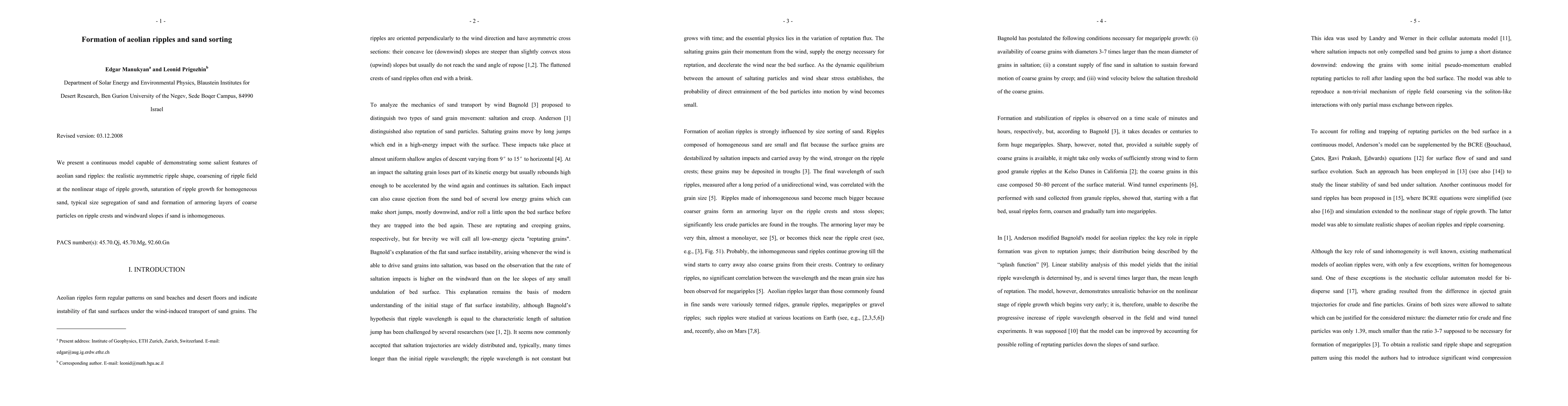 The paper develops a continuous model illustrating the formation of aeolian sand ripples, highlighting asymmetric ripple shapes, coarsening in ripple fields, and armoring layers of coarse particles in inhomogeneous sand. The model also explains saturation growth and size segregation in ripple formation.