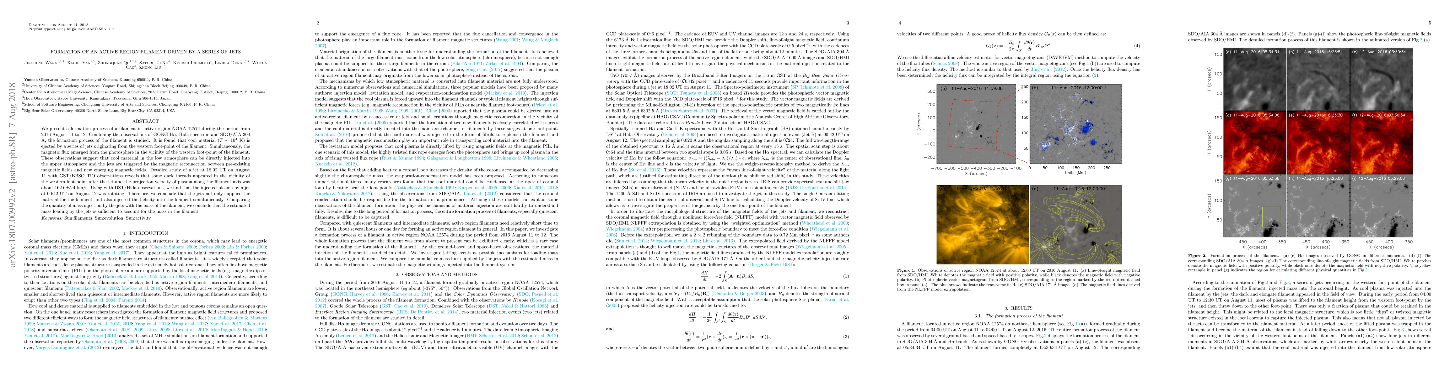 This study investigates the formation of a filament in active region NOAA 12574 through a series of jets that ejected cool material and emerging magnetic flux. The jets, triggered by magnetic reconnection, supplied material and helicity to the filament, with sufficient mass injection to account for the filament's mass.