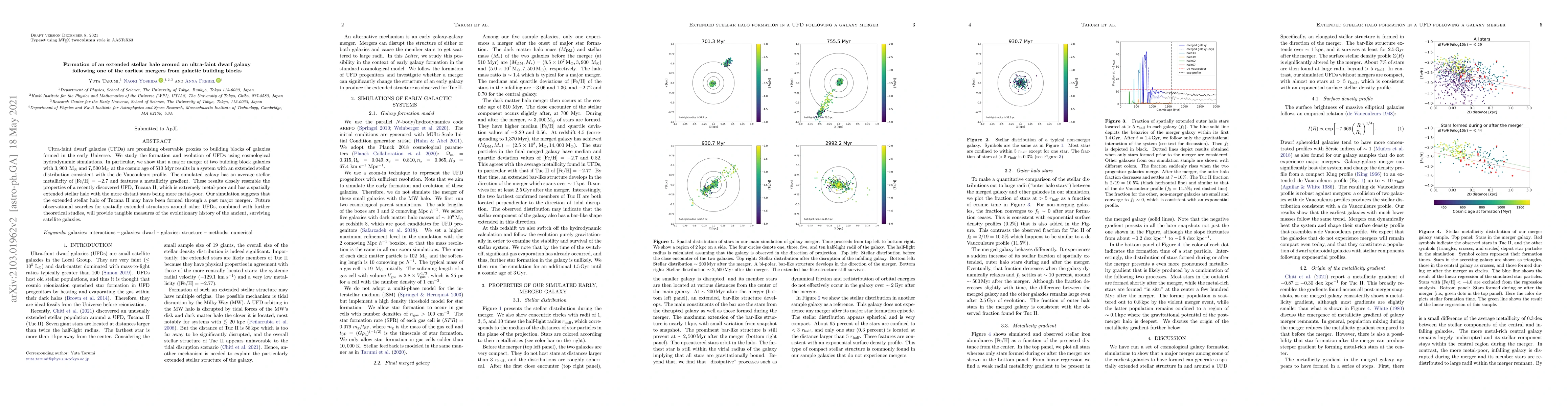 This research uses cosmological simulations to demonstrate that a major merger of two early universe galaxies can form an ultra-faint dwarf galaxy (UFD) like Tucana II, with an extended stellar halo and metallicity gradient. The study suggests Tucana II's properties, including its metal-poor nature and spatially extended halo, could stem from such a merger event, highlighting the importance of mergers in shaping ancient satellite galaxies.