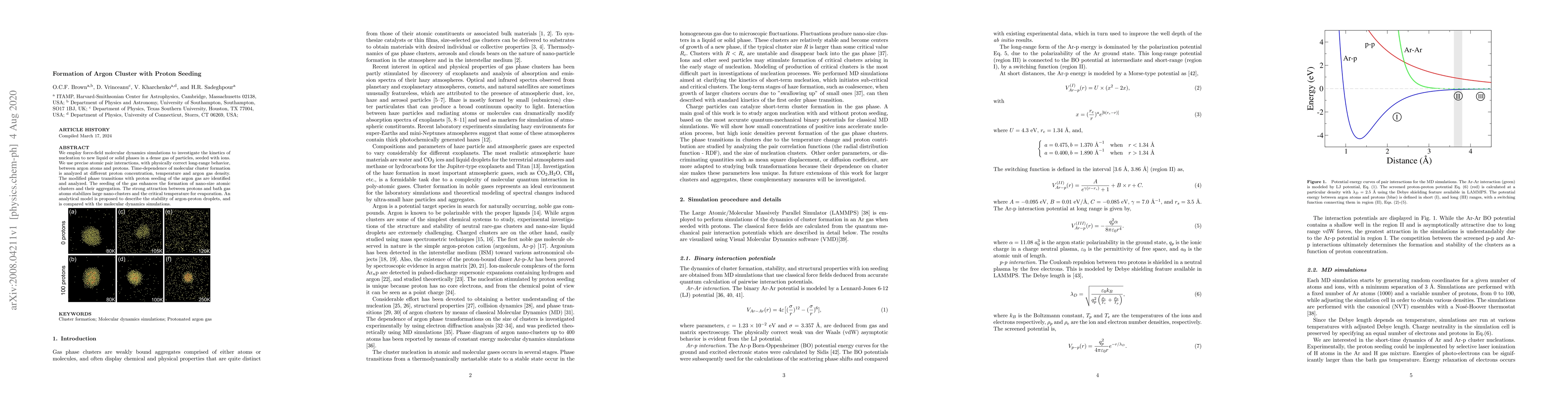 This study uses molecular dynamics simulations to explore how proton seeding influences argon cluster formation. It identifies enhanced nano-cluster creation and aggregation due to strong proton-argon atom attraction, proposing an analytical model to describe stable argon-proton droplets.