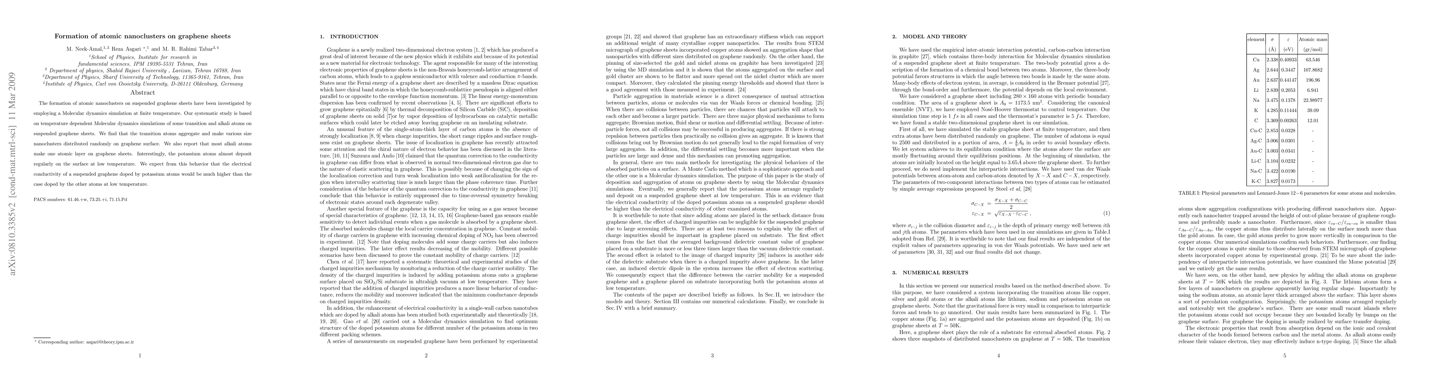 The study uses molecular dynamics simulations to investigate atomic nanocluster formation on graphene sheets, revealing that transition atoms form various size nanoclusters while alkali atoms, especially potassium, deposit regularly at low temperatures, potentially enhancing the electrical conductivity of doped graphene.
