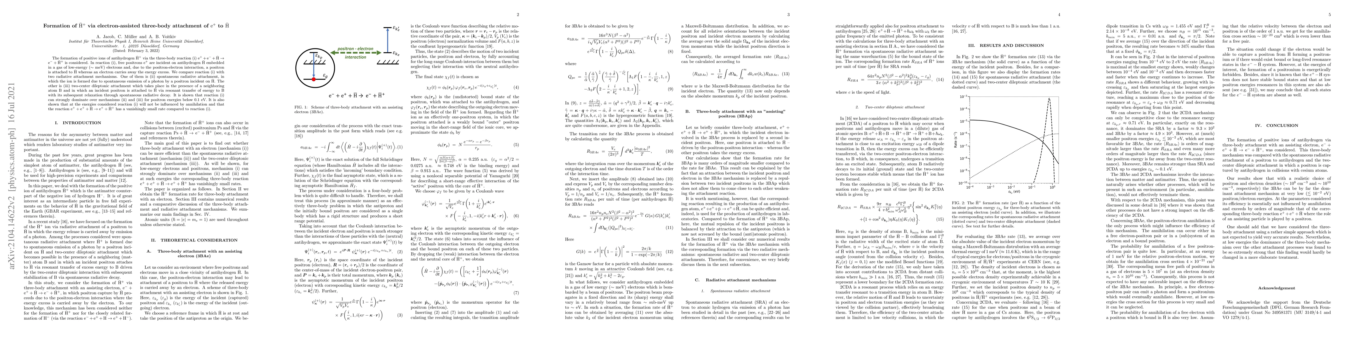 This paper investigates the formation of antihydrogen positive ions ($\bar{\rm{H}}^+$) via a three-body reaction involving positrons and electrons, showing that this mechanism dominates over radiative attachment processes for positron energies below $0.1$ eV. The study also confirms that annihilation does not affect this reaction and that a competing reaction has an insignificant rate.