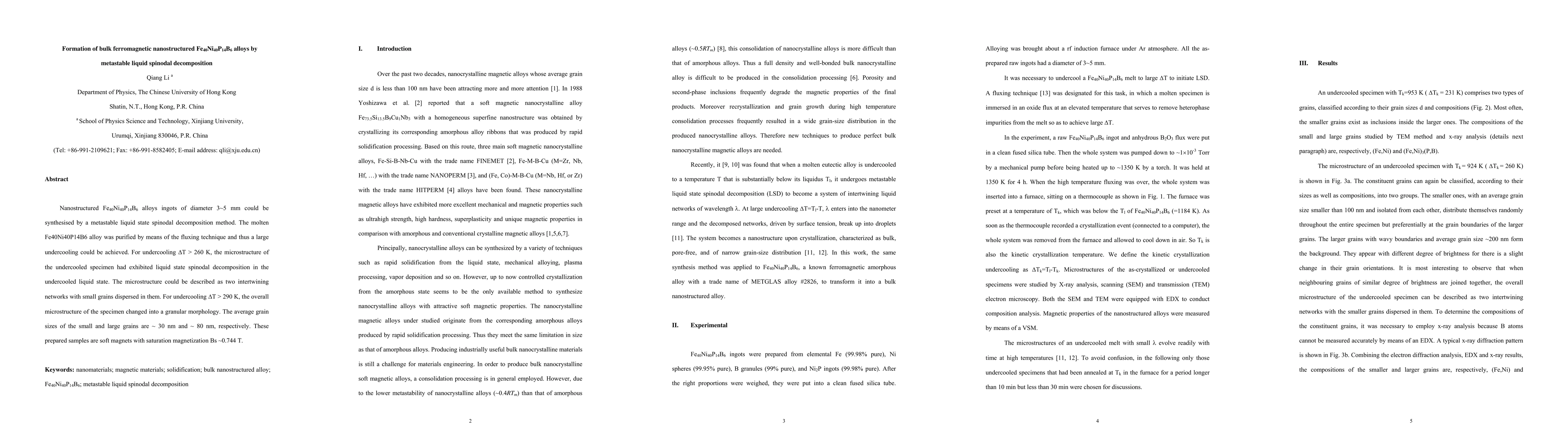 This study details the synthesis of nanostructured Fe40Ni40P14B6 alloys using metastable liquid spinodal decomposition, leading to microstructures with grain sizes around 30 nm and 80 nm, and exhibiting ferromagnetic properties with saturation magnetization of ~0.744 T.