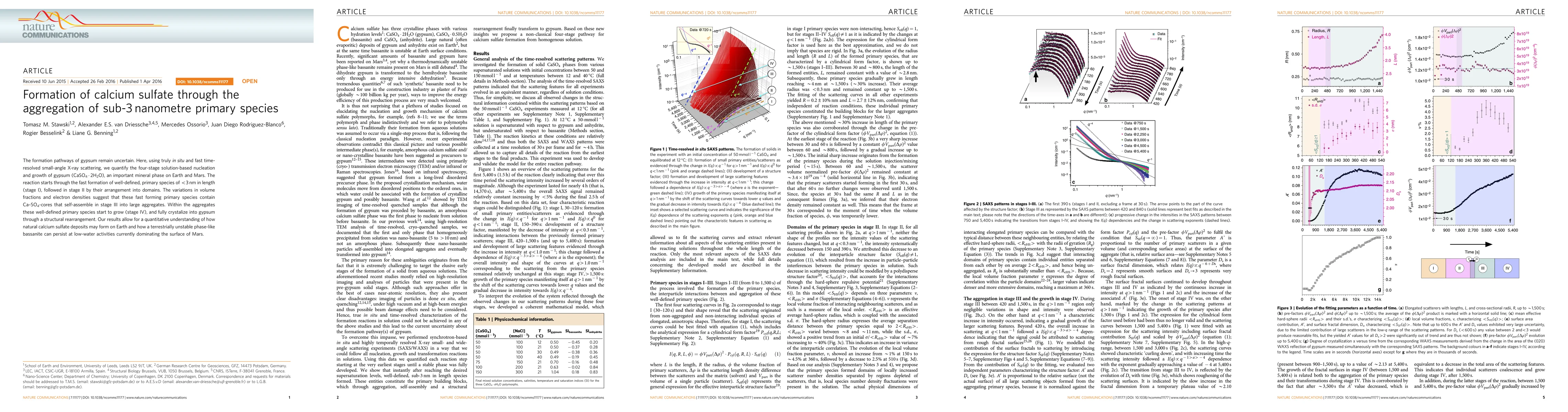 The formation of crystalline calcium sulfate (CaSO4*xH2O) polymorphs from aqueous solutions is assumed to occur via a single-step process following the classical nucleation paradigm. However, although recent research contradicts this classical picture and indicates that CaSO4*2H2O forms at room temperature through multiple steps at different length and time-scales, these steps have so far not been quantified. By using in situ and fast time-resolved small angle X-ray scattering (SAXS), we demonstrate that the nucleation and growth of CaSO4*2H2O involves at the very initial stages the formation of well-defined, primary species of < 3 nm in length (stage I). Stage II of the reaction is characterized by the arrangement of these primary species into domains, while in stage III these domains condense into larger aggregates. Based on volume fractions and electron density considerations we propose that the fast forming primary species from supersaturated aqueous CaSO4 solutions are composed of anhydrous Ca-SO4-cores. The first three stages of nucleation and aggregation of the primary species are followed by a final stage (stage IV), where the primary species grow within the aggregates, and eventually transform into gypsum (CaSO4*2H2O). This final stage was also confirmed through simultaneously collected wide-angle scattering (diffraction, WAXS) data, which clearly show the growth of gypsum during stage IV only. Our results demonstrate that CaSO4 formation is driven by the nucleation and aggregation of well-defined anhydrous Ca-SO4-cores that transform through hydration into gypsum through a complex nucleation and growth pathway.