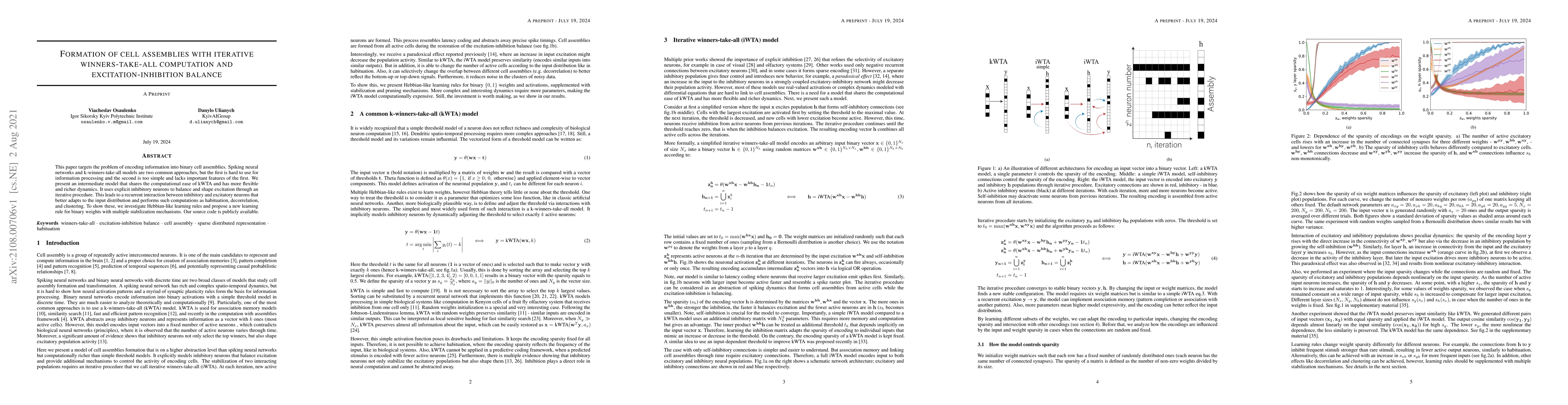 This paper targets the problem of encoding information into binary cell assemblies. Spiking neural networks and k-winners-take-all models are two common approaches, but the first is hard to use for information processing and the second is too simple and lacks important features of the first. We present an intermediate model that shares the computational ease of kWTA and has more flexible and richer dynamics. It uses explicit inhibitory neurons to balance and shape excitation through an iterative procedure. This leads to a recurrent interaction between inhibitory and excitatory neurons that better adapts to the input distribution and performs such computations as habituation, decorrelation, and clustering. To show these, we investigate Hebbian-like learning rules and propose a new learning rule for binary weights with multiple stabilization mechanisms. Our source code is publicly available.