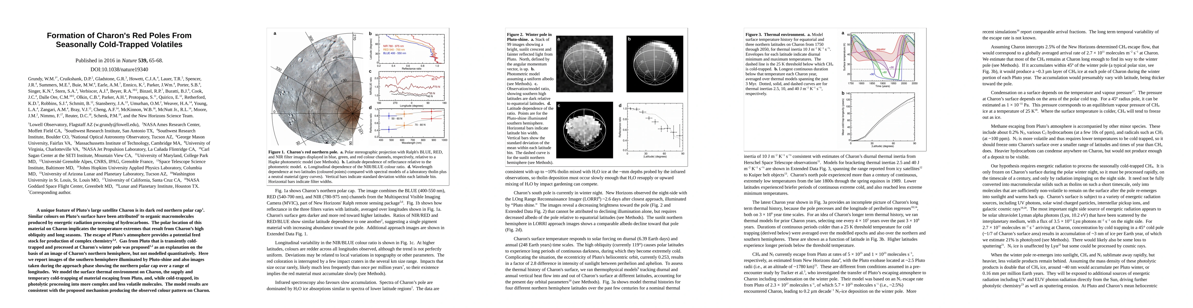 This research investigates the formation of Charon's red polar cap through the seasonally cold-trapped volatiles escaping from Pluto, proposing that photolytic processing of these materials under extreme temperature conditions leads to the observed coloration. The study combines thermal modeling and imaging to support the hypothesis that the red color results from complex organic molecules formed by radiation processing.