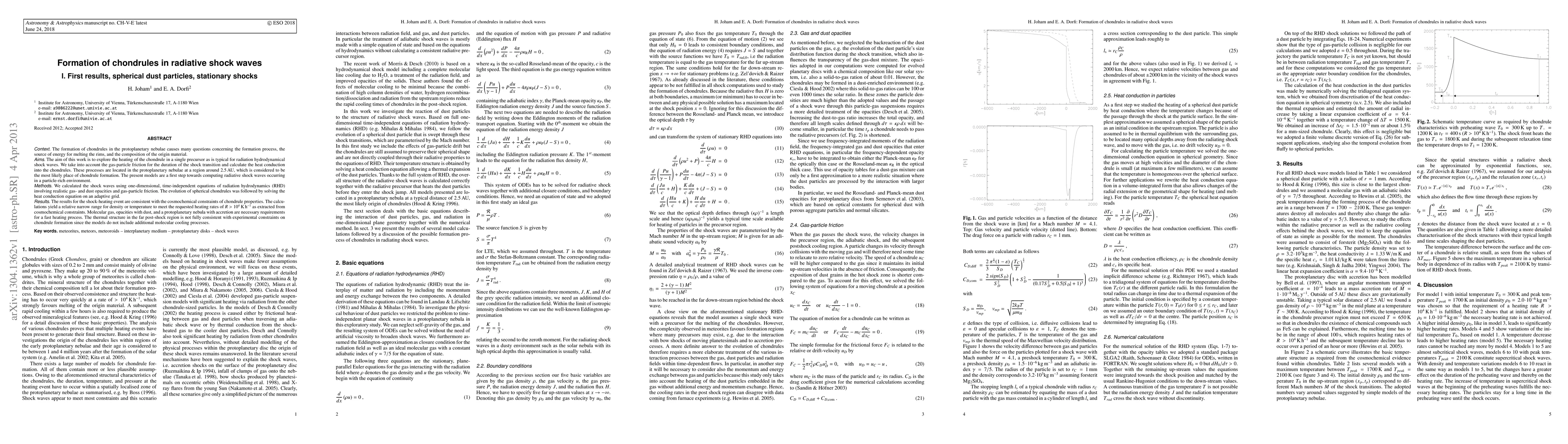 The research employs one-dimensional, time-independent equations of radiation hydrodynamics involving realistic gas and dust opacities and gas-particle friction to model radiative shock waves in a particle-rich environment, specifically focusing on the heating of chondrules in protoplanetary nebulae.