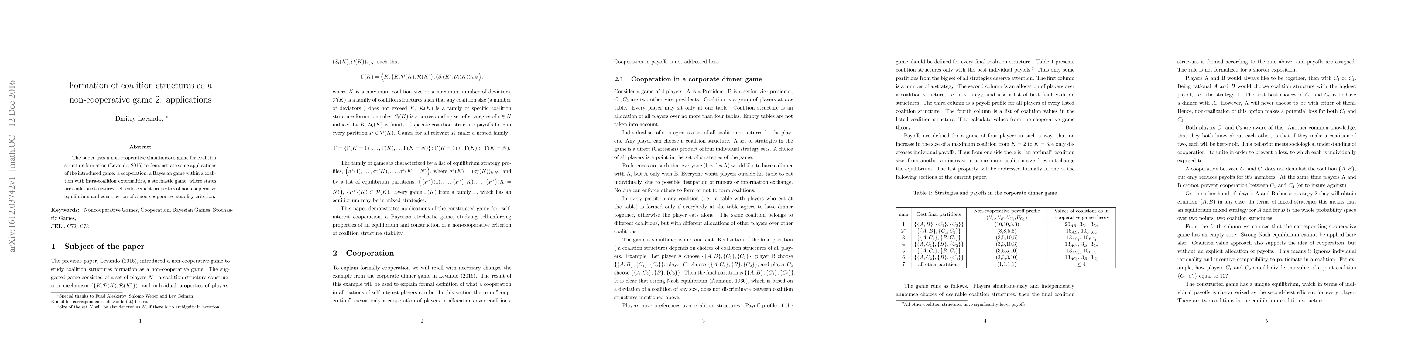 The paper uses a non-cooperative simultaneous game for coalition structure formation (Levando, 2016) to demonstrate some applications of the introduced game: a cooperation, a Bayesian game within a coalition with intra-coalition externalities, a stochastic game, where states are coalition structures; self-enforcement properties of a non-cooperative equilibrium and a construction of a non-cooperative stability criterion.