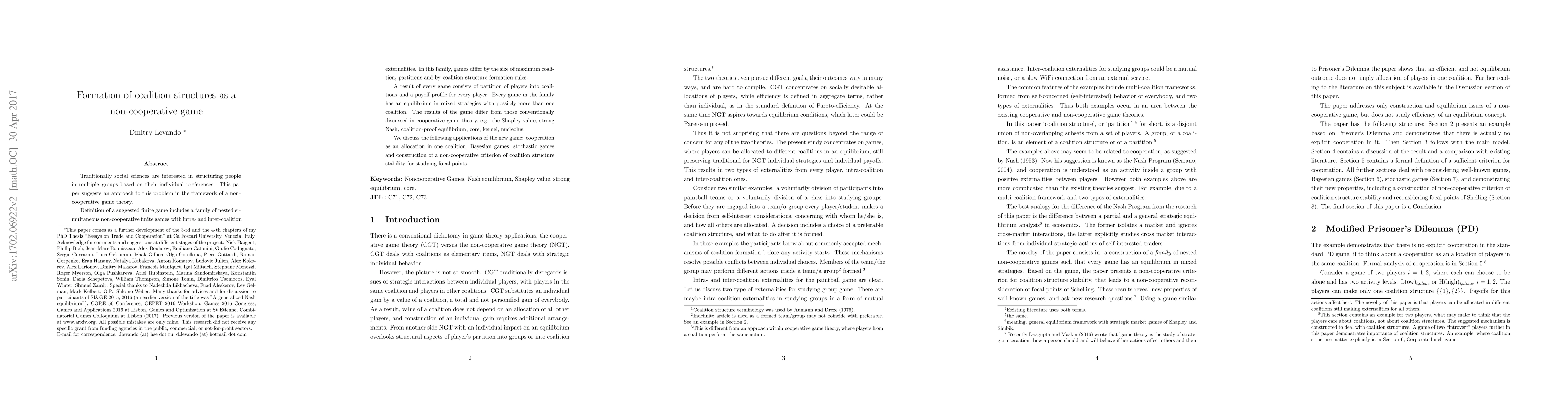 Traditionally social sciences are interested in structuring people in multiple groups based on their individual preferences. This pa- per suggests an approach to this problem in the framework of a non- cooperative game theory. Definition of a suggested finite game includes a family of nested simultaneous non-cooperative finite games with intra- and inter-coalition externalities. In this family, games differ by the size of maximum coalition, partitions and by coalition structure formation rules. A result of every game consists of partition of players into coalitions and a payoff? profiles for every player. Every game in the family has an equilibrium in mixed strategies with possibly more than one coalition. The results of the game differ from those conventionally discussed in cooperative game theory, e.g. the Shapley value, strong Nash, coalition-proof equilibrium, core, kernel, nucleolus. We discuss the following applications of the new game: cooperation as an allocation in one coalition, Bayesian games, stochastic games and construction of a non-cooperative criterion of coalition structure stability for studying focal points.