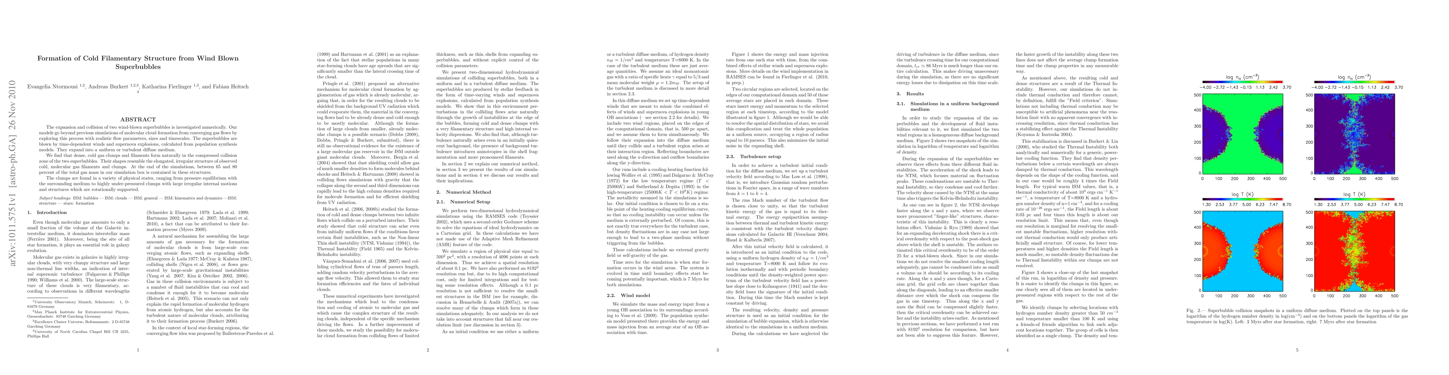 This research numerically investigates the formation of cold filamentary structures from the collision of two wind-blown superbubbles, revealing that dense, cold gas clumps and filaments form naturally in the compressed collision zone. These structures resemble observed cold, molecular gas filaments and account for 65-80% of the total gas mass in the simulation box.